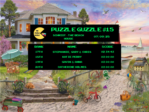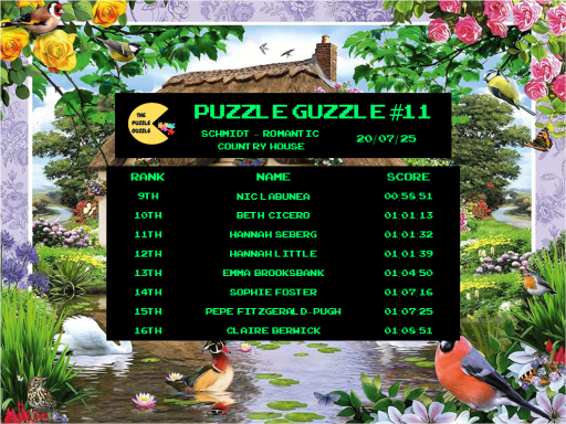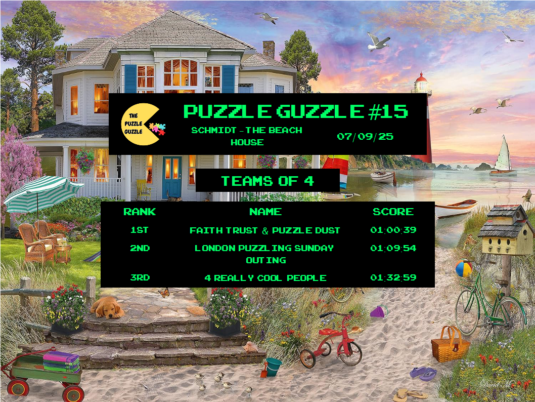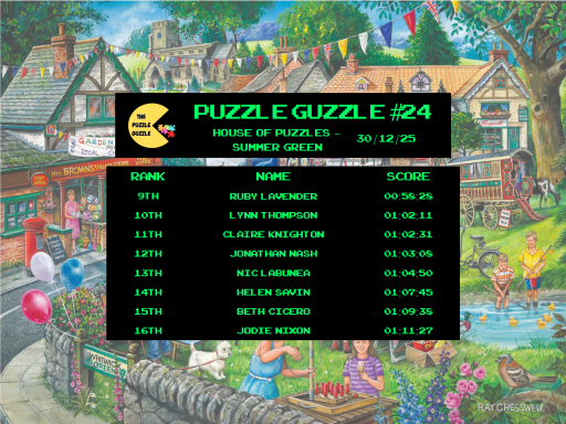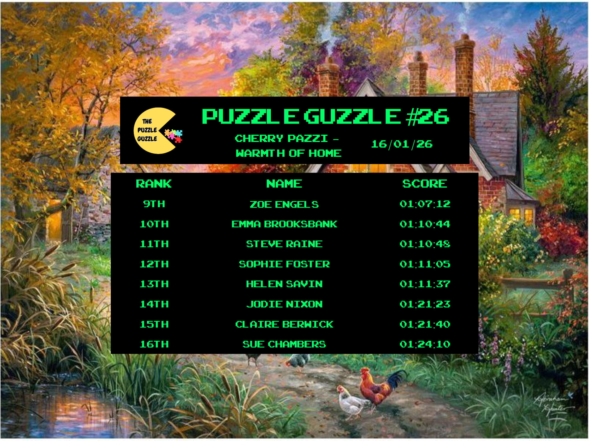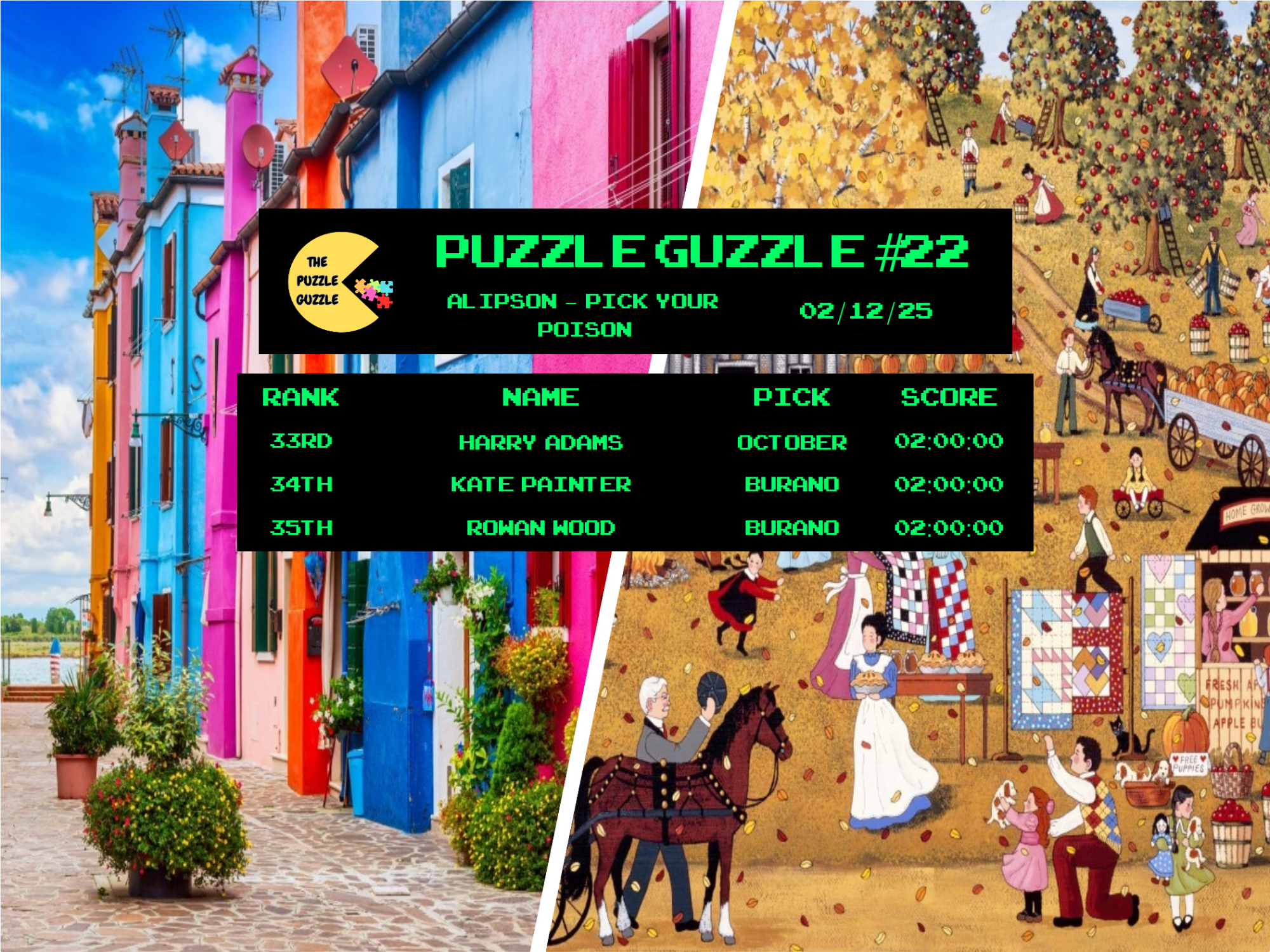 A full field of 40 puzzlers joined us on Friday to cozy up next to the fire and tackle this serene painted scene. A close race was predicted but one puzzler had other ideas. The mysterious Eirik ran away with the competition, completing this challenging image in just 46:17!! It would then be over 13 minutes later when puzzling luminary SJ hit the buzzer and beat Zak to the silver medal by just one second! This marked personal best solo finishes in The Puzzle Guzzle for all 3 podium places, a feat not seen since our very first competition!