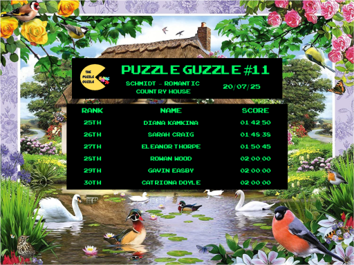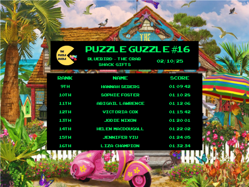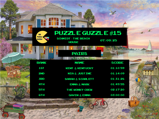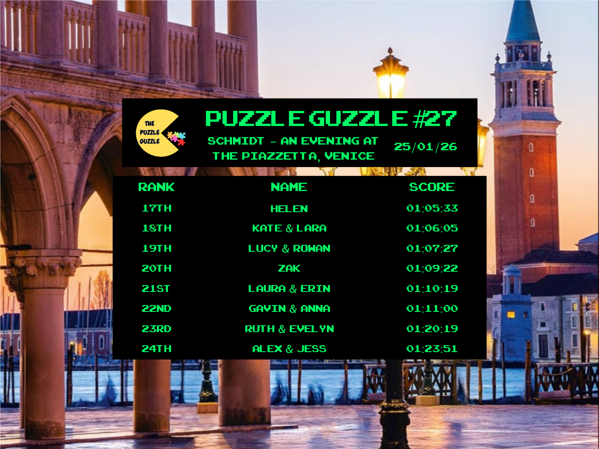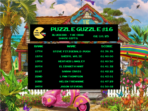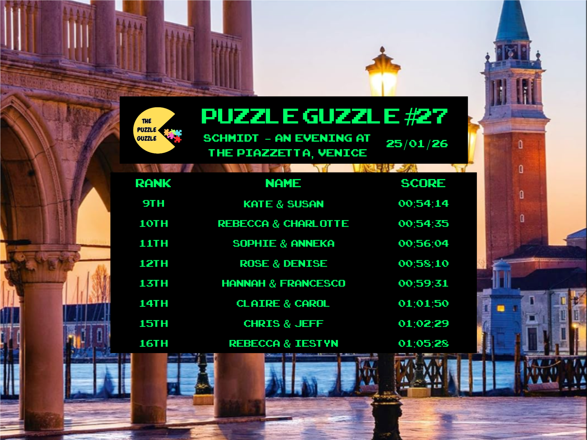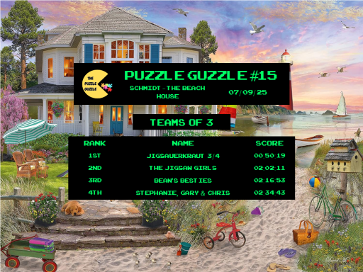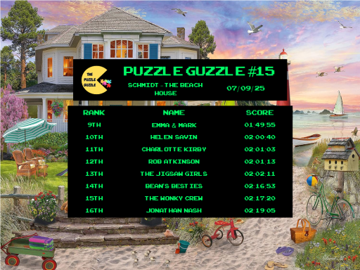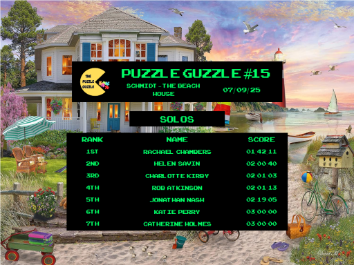 A full field of 40 puzzlers joined us on Friday to cozy up next to the fire and tackle this serene painted scene. A close race was predicted but one puzzler had other ideas. The mysterious Eirik ran away with the competition, completing this challenging image in just 46:17!! It would then be over 13 minutes later when puzzling luminary SJ hit the buzzer and beat Zak to the silver medal by just one second! This marked personal best solo finishes in The Puzzle Guzzle for all 3 podium places, a feat not seen since our very first competition!