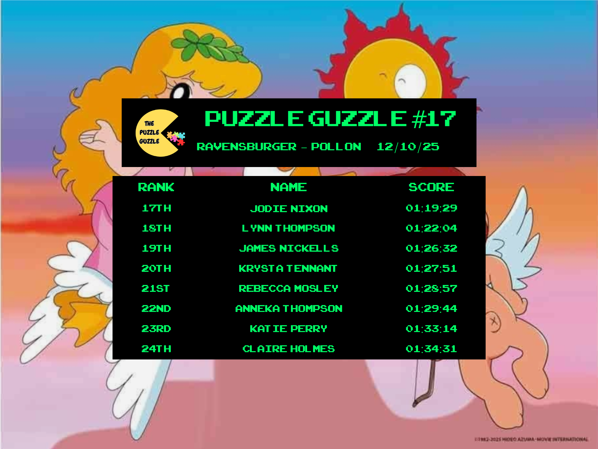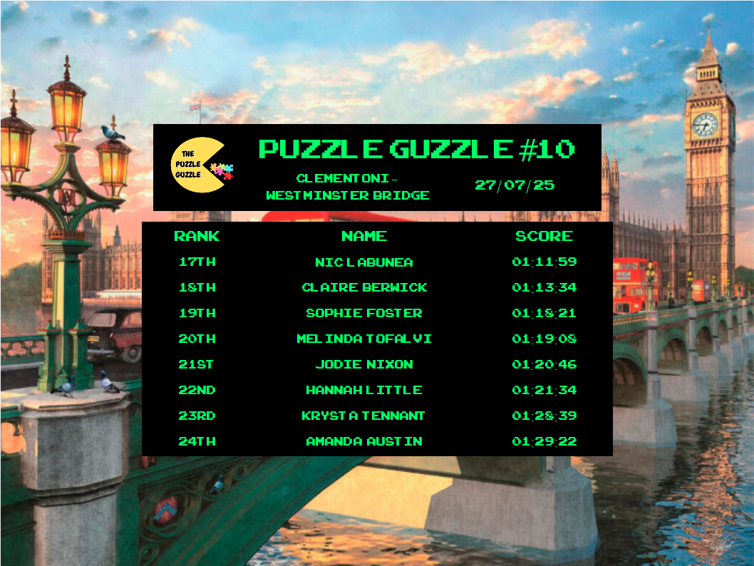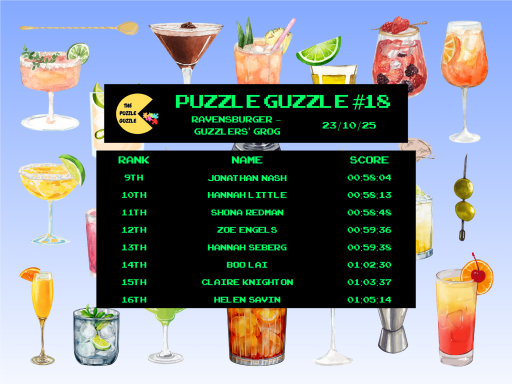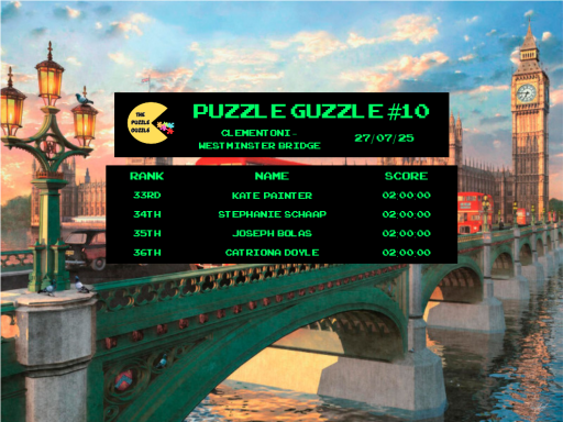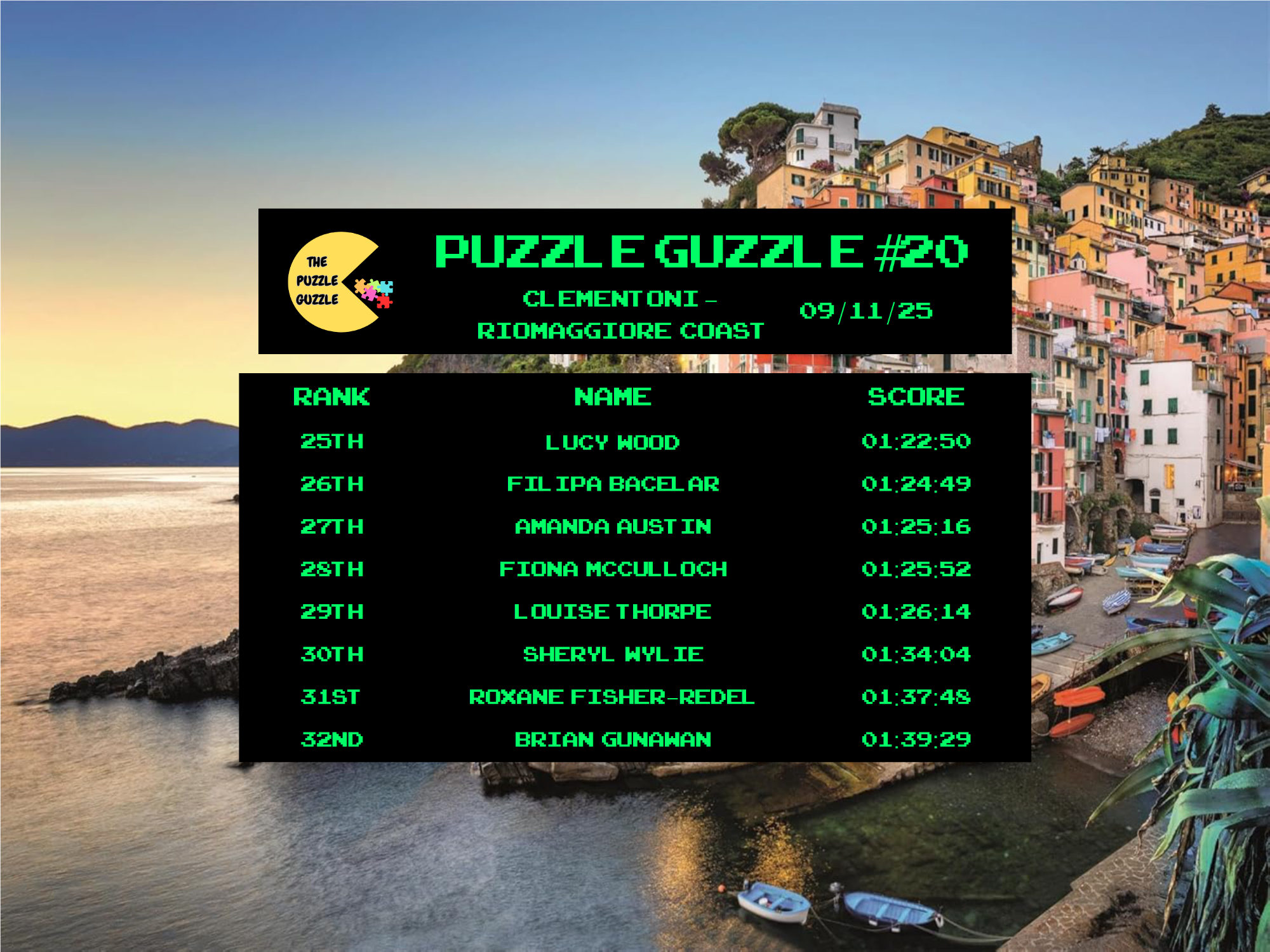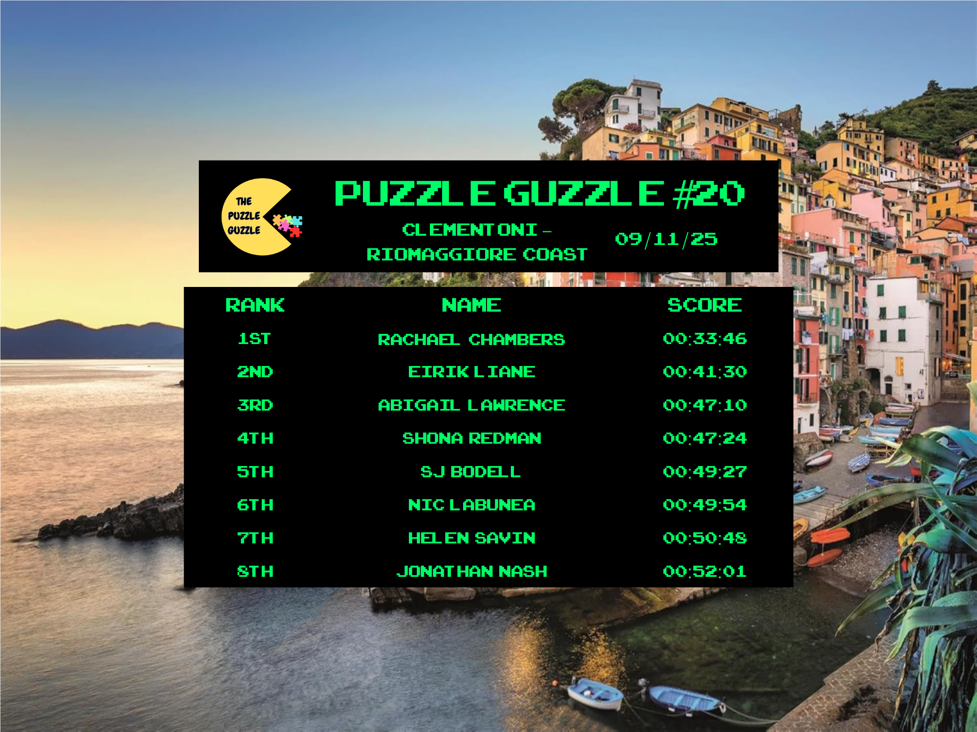 35 festive fete-goers competing from 5 countries joined us last night for our final competition of 2025! The puzzle picker threw a curveball in the form of the first random cut puzzle in Guzzle history, but that didn't stop our formidable field from putting up some sensational times! Rachael continued her reign of terror over the Guzzle with her 41:10 time beating out Irish phenom Emma Quirke by just 4 seconds, and Swedish sensation Tobias Premier had all pieces placed in just 45:10 to comfortably secure 3rd place!