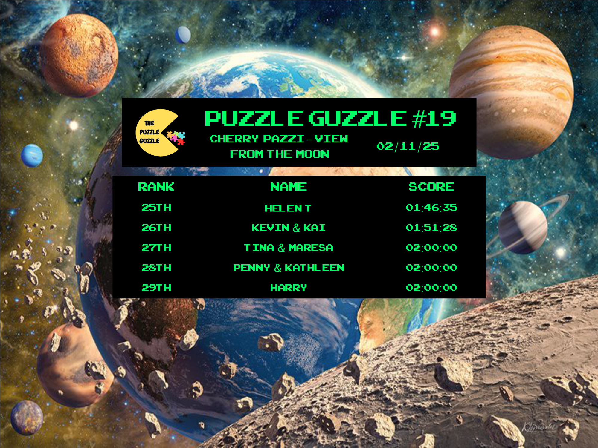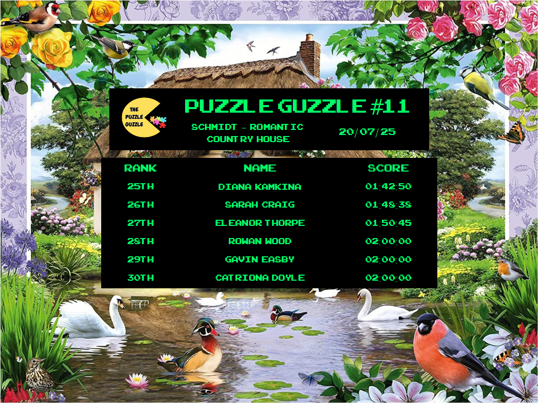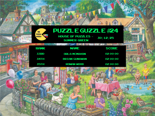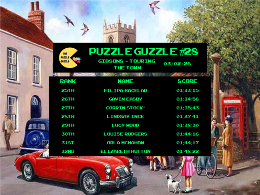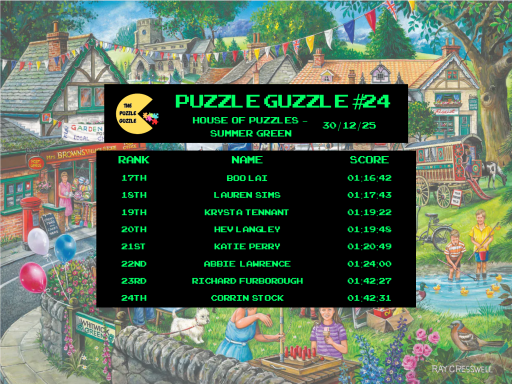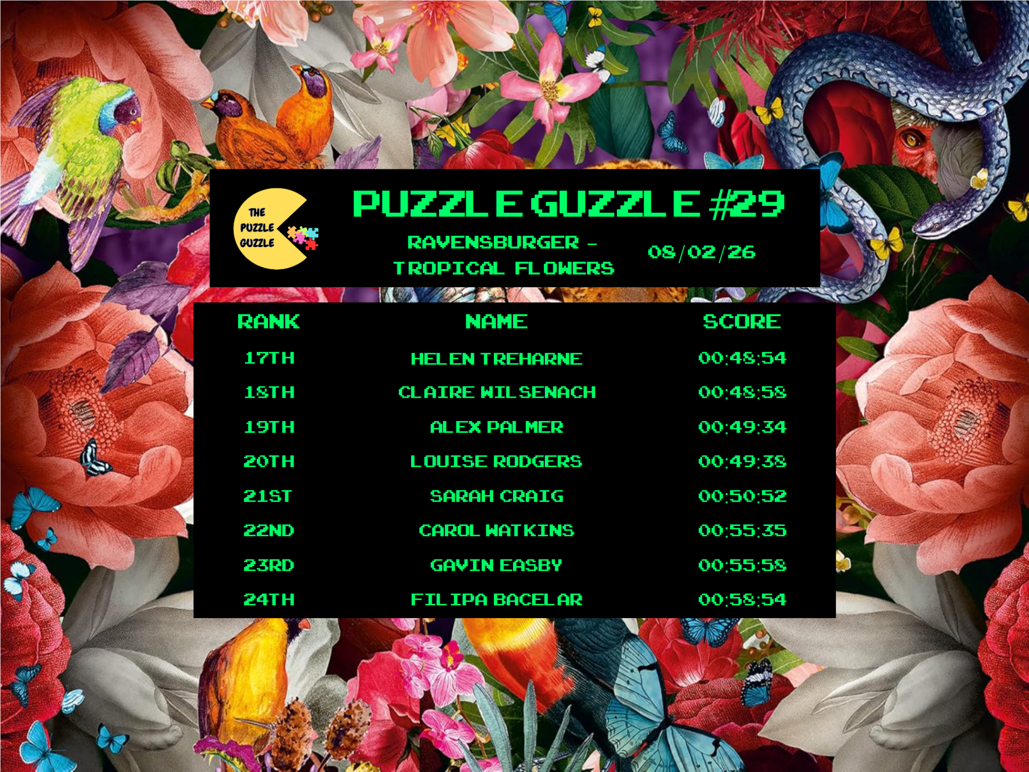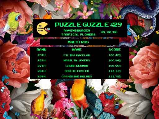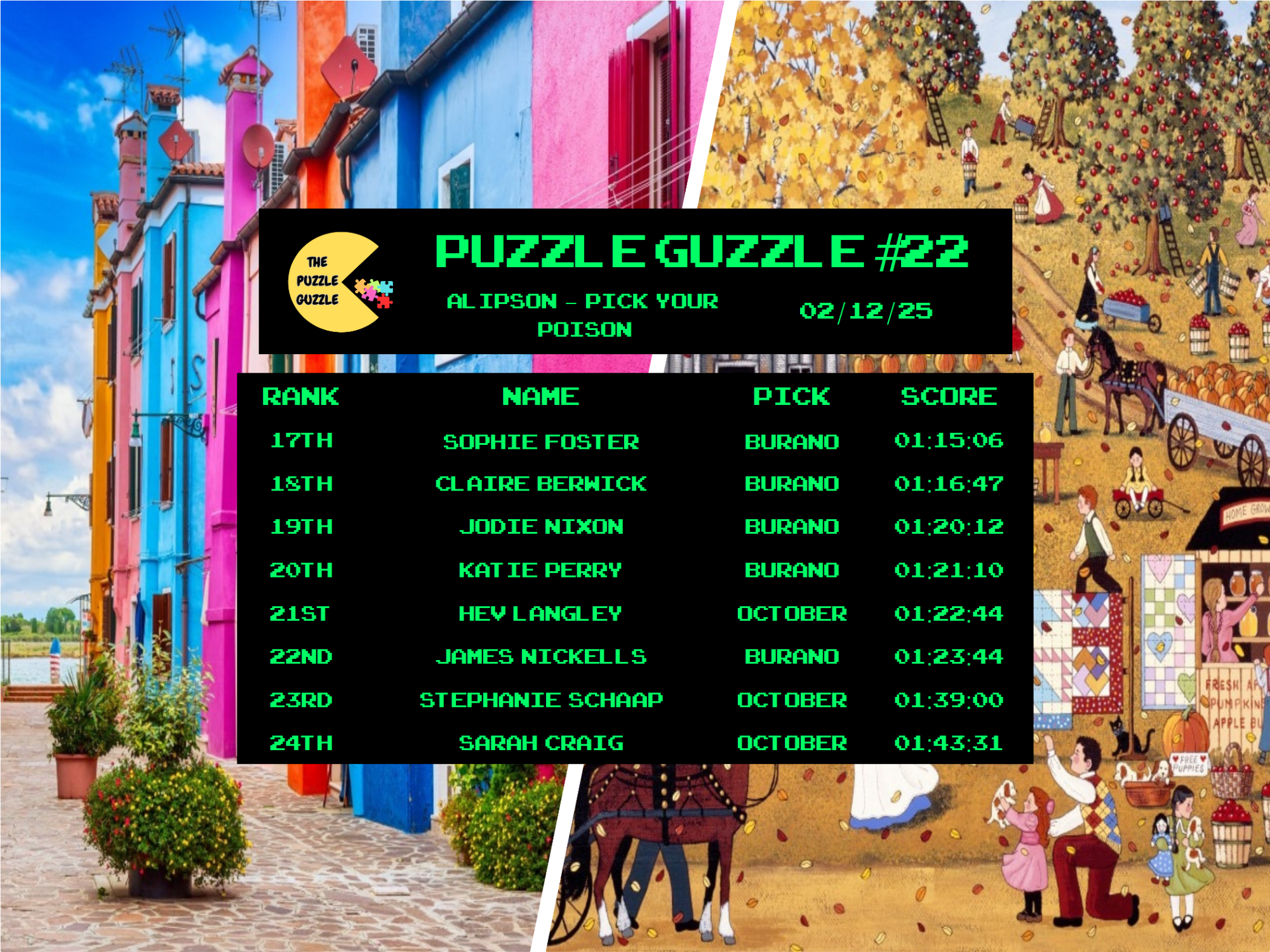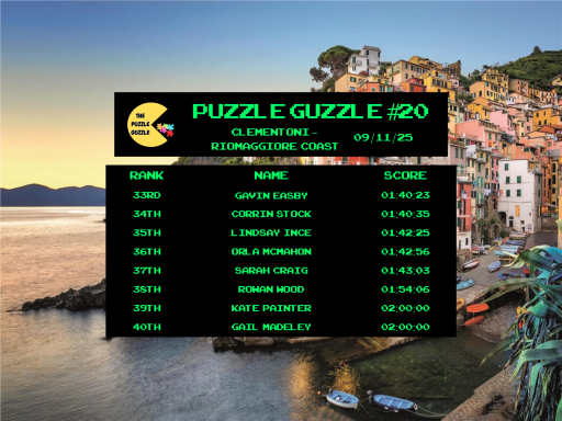 35 festive fete-goers competing from 5 countries joined us last night for our final competition of 2025! The puzzle picker threw a curveball in the form of the first random cut puzzle in Guzzle history, but that didn't stop our formidable field from putting up some sensational times! Rachael continued her reign of terror over the Guzzle with her 41:10 time beating out Irish phenom Emma Quirke by just 4 seconds, and Swedish sensation Tobias Premier had all pieces placed in just 45:10 to comfortably secure 3rd place!