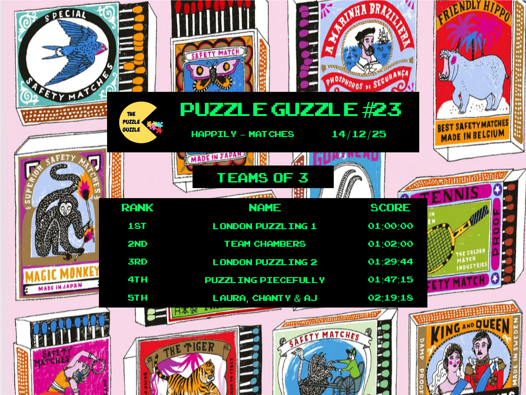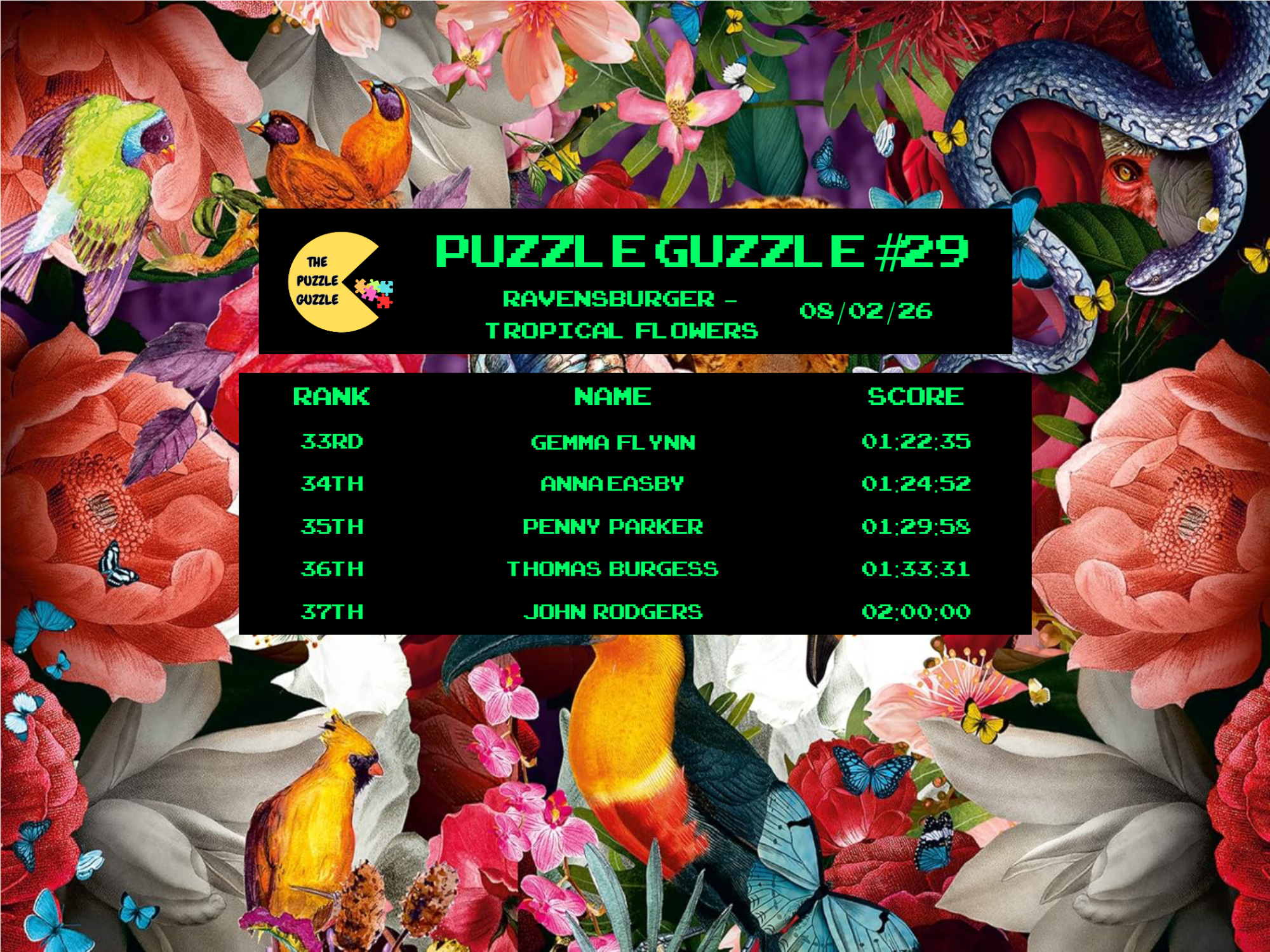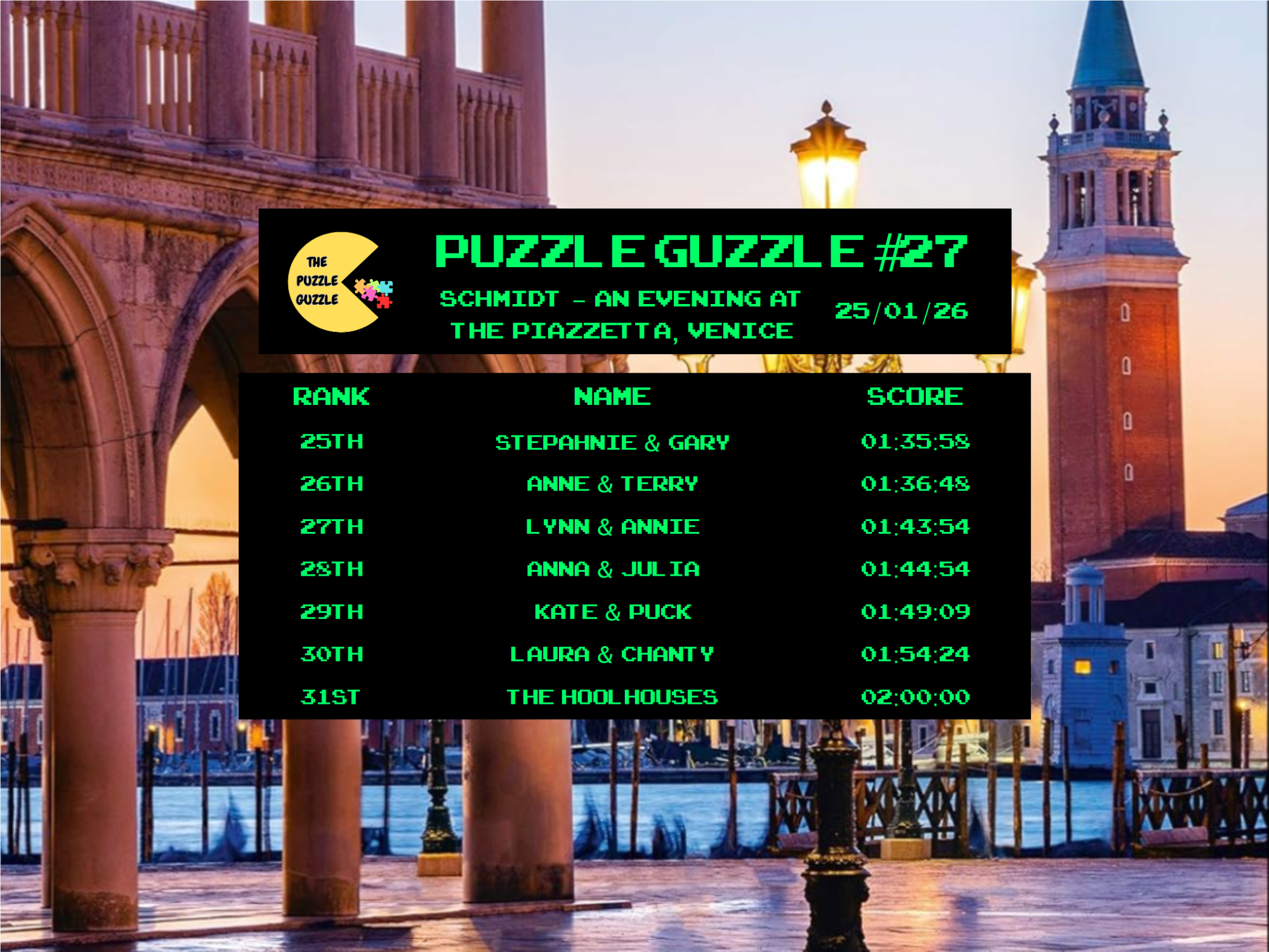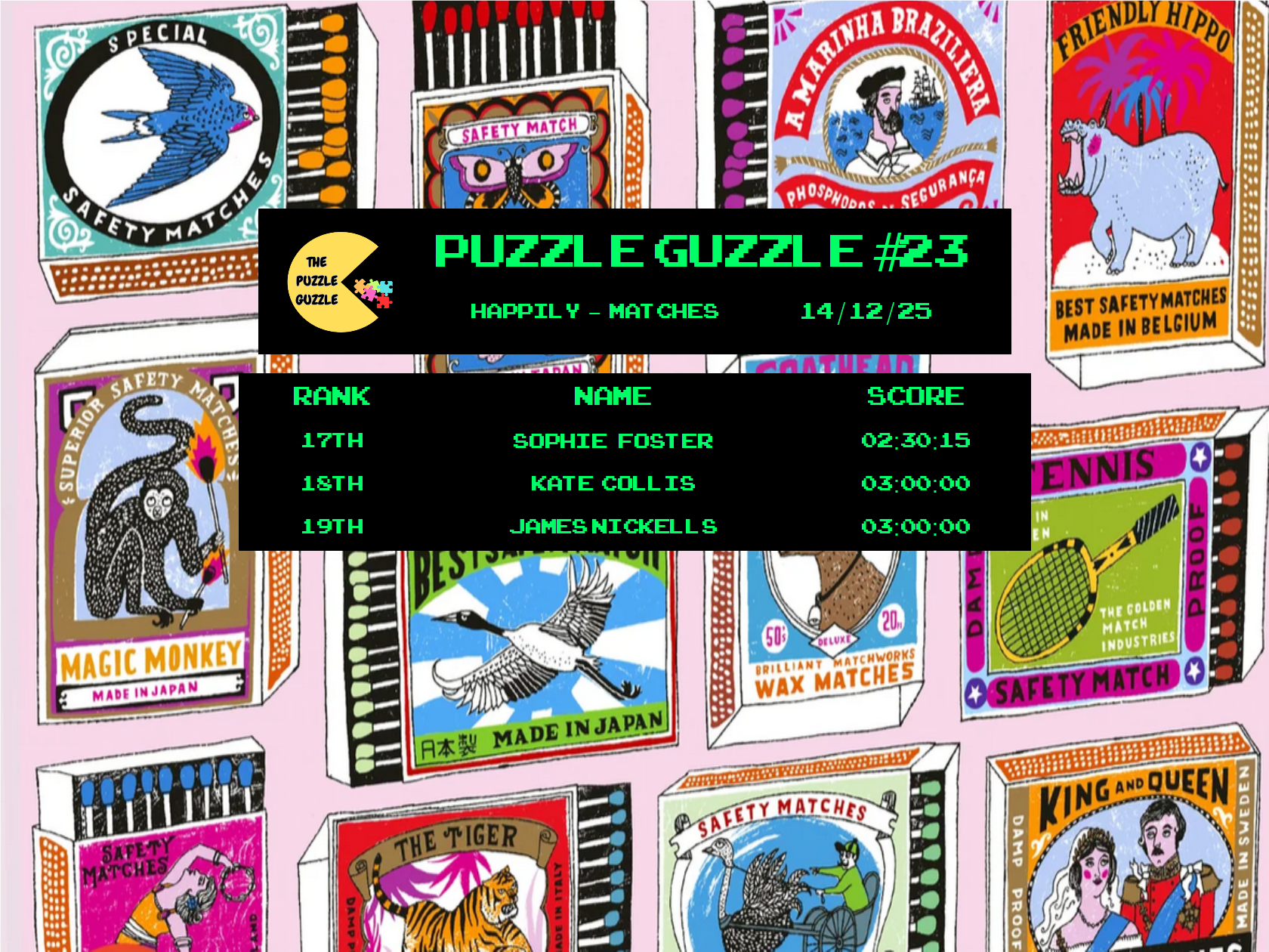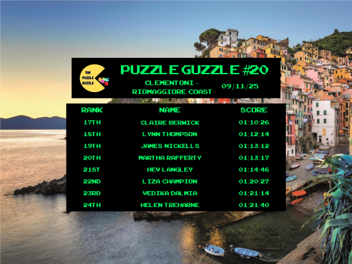 35 festive fete-goers competing from 5 countries joined us last night for our final competition of 2025! The puzzle picker threw a curveball in the form of the first random cut puzzle in Guzzle history, but that didn't stop our formidable field from putting up some sensational times! Rachael continued her reign of terror over the Guzzle with her 41:10 time beating out Irish phenom Emma Quirke by just 4 seconds, and Swedish sensation Tobias Premier had all pieces placed in just 45:10 to comfortably secure 3rd place!