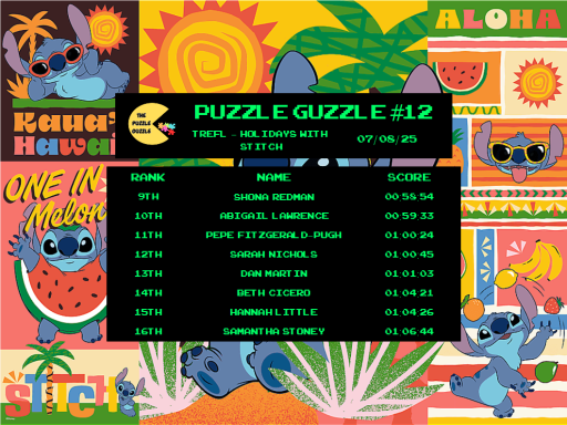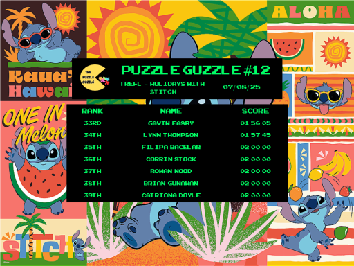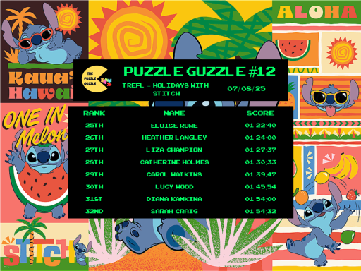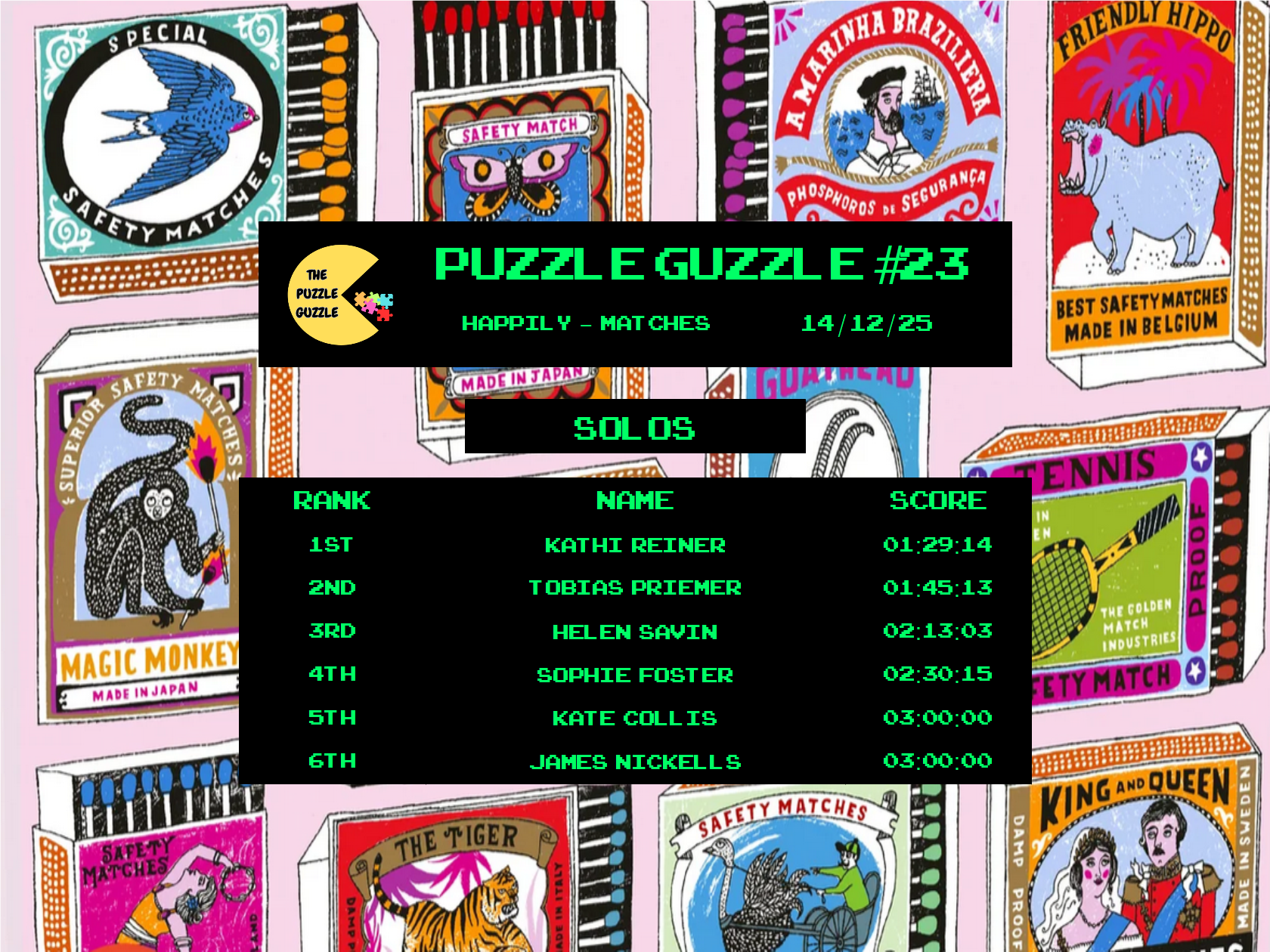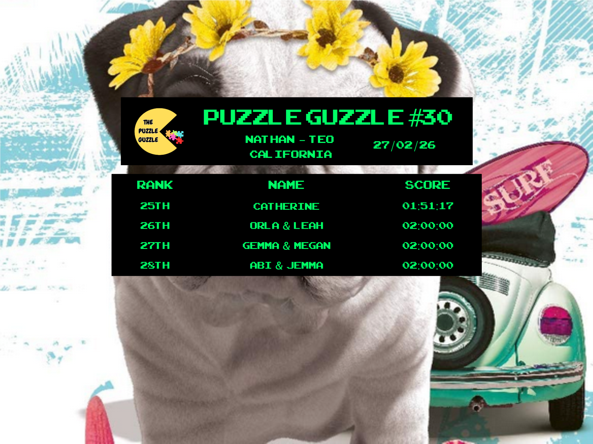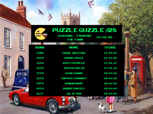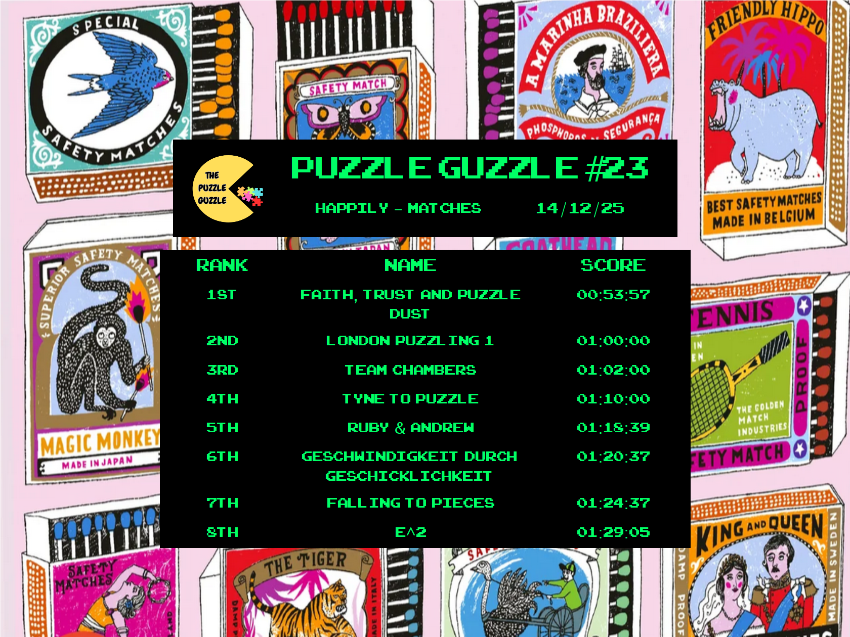 35 festive fete-goers competing from 5 countries joined us last night for our final competition of 2025! The puzzle picker threw a curveball in the form of the first random cut puzzle in Guzzle history, but that didn't stop our formidable field from putting up some sensational times! Rachael continued her reign of terror over the Guzzle with her 41:10 time beating out Irish phenom Emma Quirke by just 4 seconds, and Swedish sensation Tobias Premier had all pieces placed in just 45:10 to comfortably secure 3rd place!