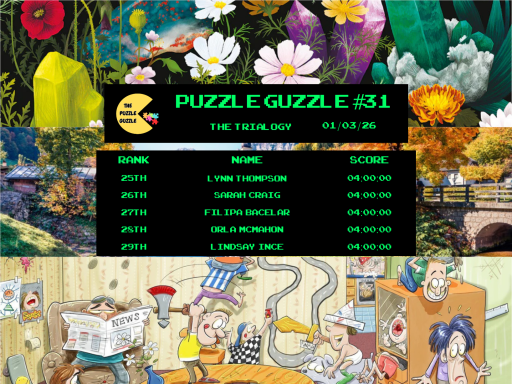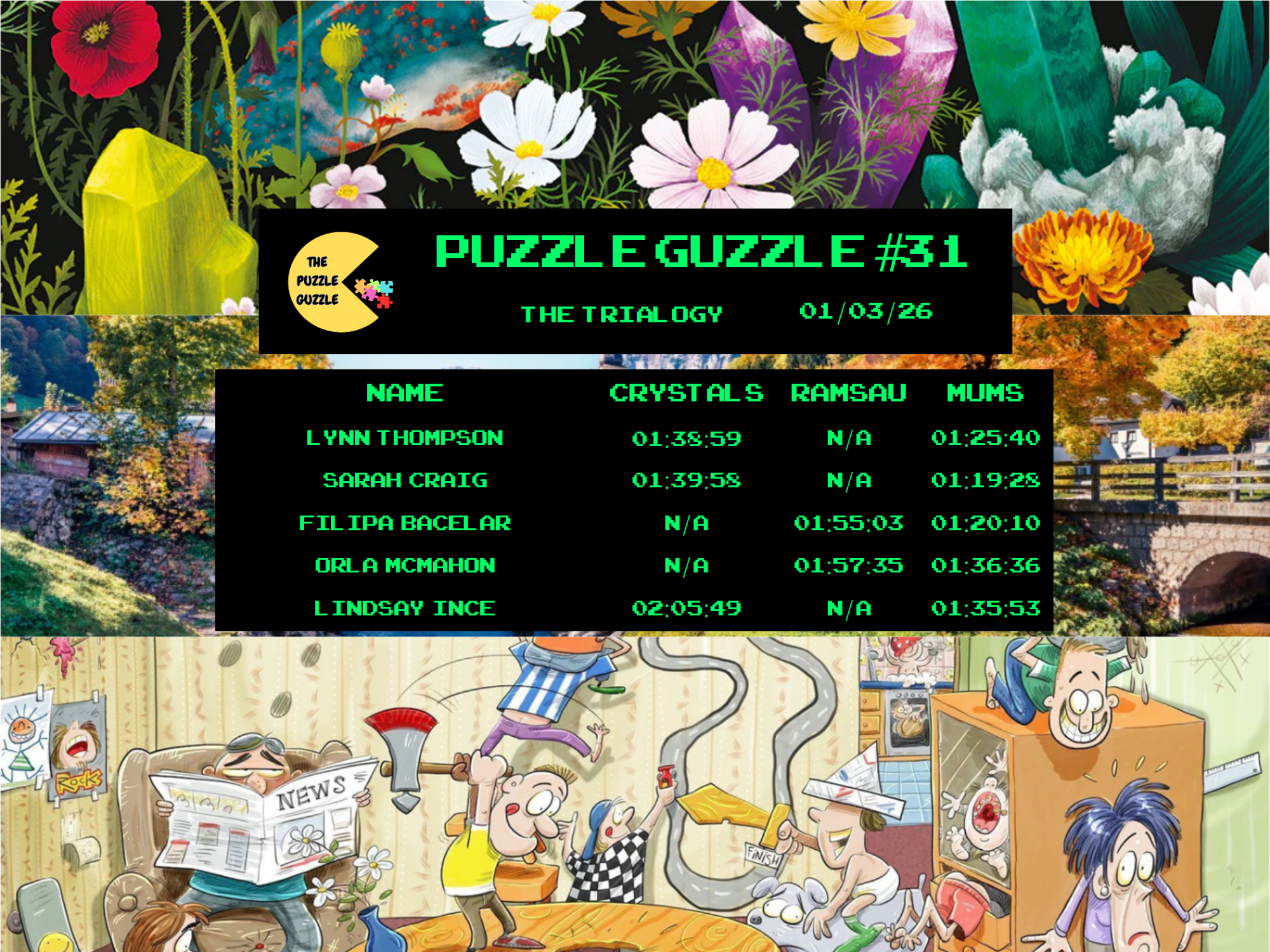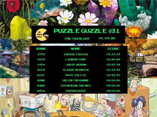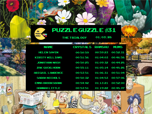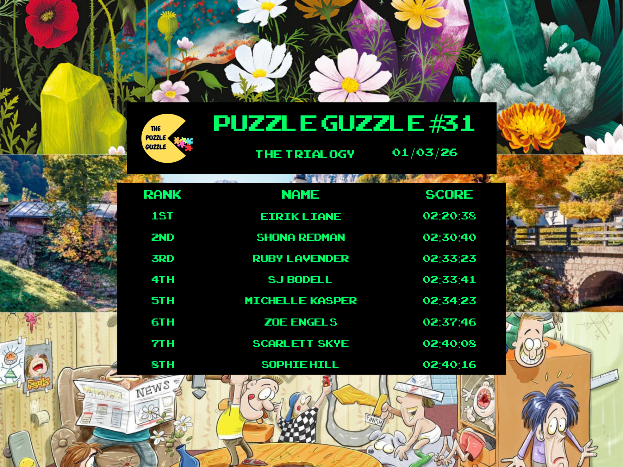29 of our most durable puzzlers joined us on Sunday to take on The Trialogy, a 3-puzzle gauntlet taking place over 4 hours. Competitors were allowed to choose their own order, which led to slightly more chaos than normal when recording times but it was fan-favourite Eirik and speed-puzzling supremo Michelle who got off to the hottest starts, both tiptoeing through the Chaos on Mothers Day in under 45 minutes! Meanwhile the peaceful Bavarian landscape of Ramsau slowed many puzzlers down, but those who tackled it early on began to make up ground on our front-runners, most notably Shona who after solving Ramsau first then put down the fastest time in the field on Crystal Healing to truly put herself back into contention.