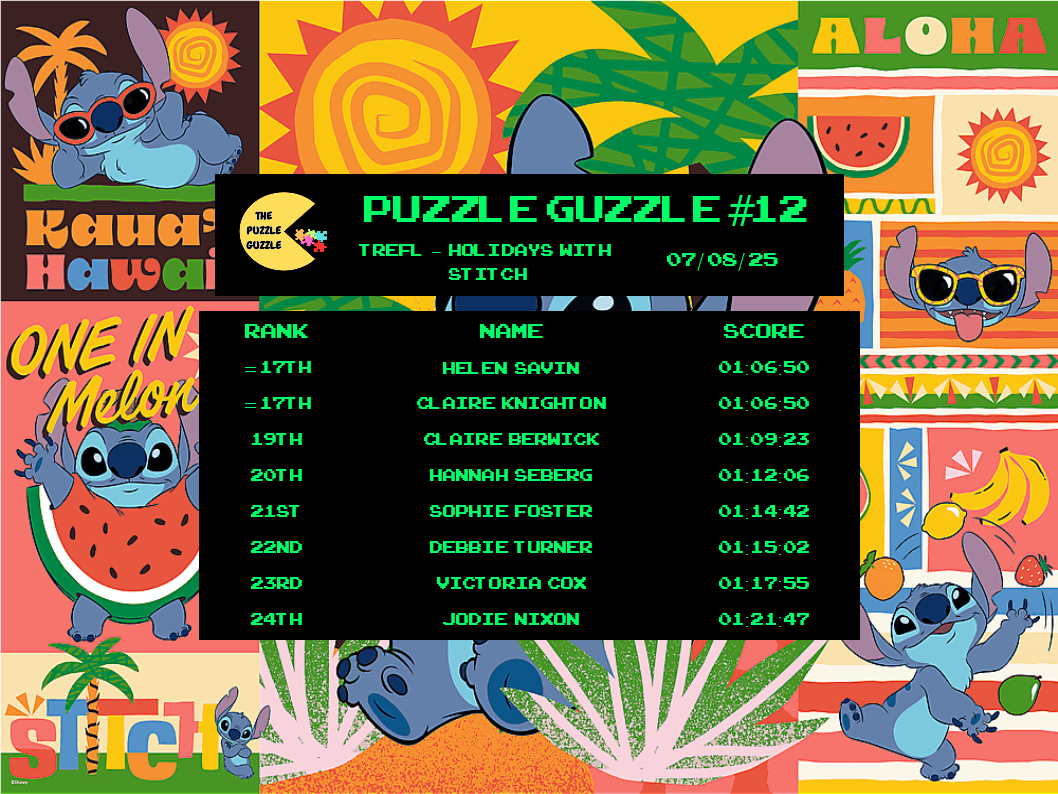 36 puzzlers sprang into action this Tuesday, some battling against 30c heat to do so! Nia took a running start by completing an EJJ mere seconds before that start of the competition but kept up the pace to win with a time of 00:43:30. The battle for second place was incredibly tight with Charlotte beating out Janey by just 8 seconds!
