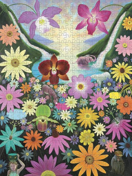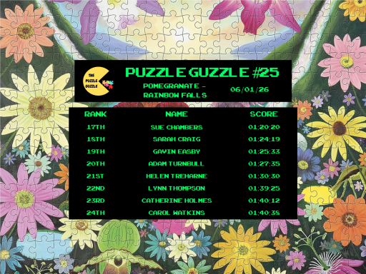 32 puzzlers joined us last night to take on the gargantuan challenge of our first "large piece" puzzle competition. Rachael Chambers frolicked through the Rainbow Falls in a superb 37:31 to mark her 10th victory in the Puzzle Guzzle! Michelle Kasper, the doyen of online puzzling competitions, scampered through the puzzle in 47:59 to take 2nd place and fan-favourite Ruby Lavender harvested another bronze medal with her 50:49 time.