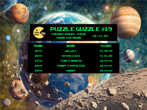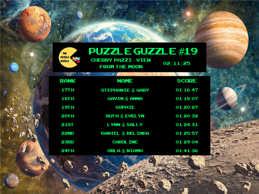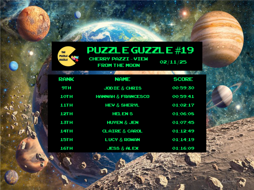 Not far behind were Eirik & Joseba in 34:36 with James & Kasia rocketed through in 39:42 to plant their flag on the podium. And a special shout out to the 6 brave moonwalkers who elected to take on this puzzle solo, the quickest of which was Rachael with an out of this world time of 42:56!