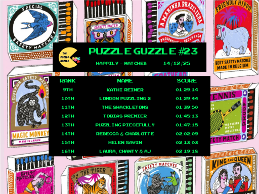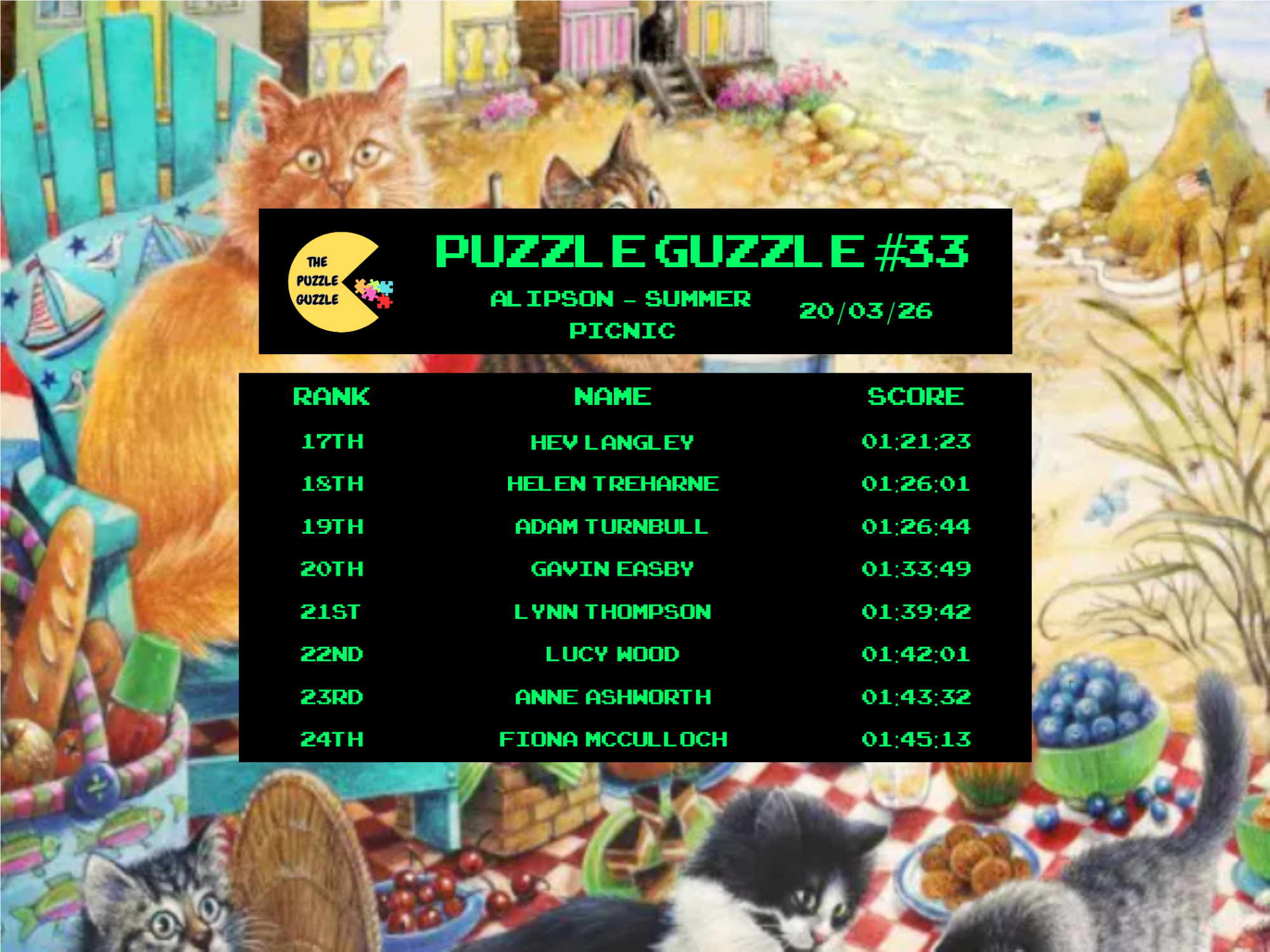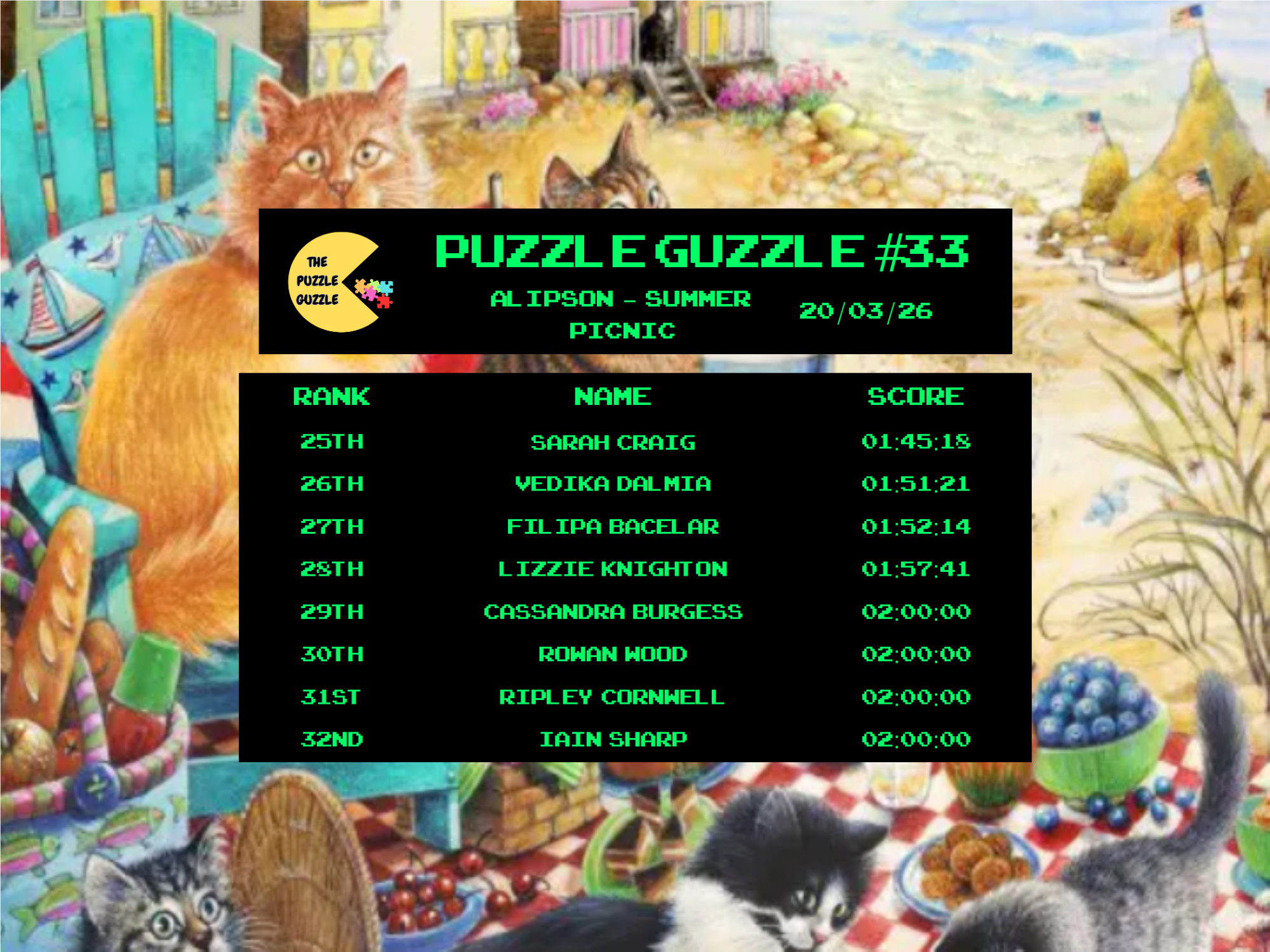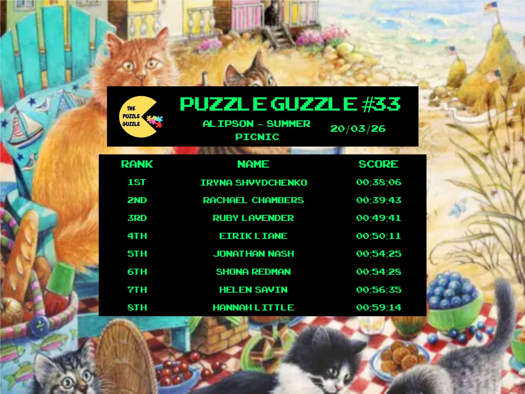 32 picnicking puzzlers joined us last night for this feline feast of a puzzle. The latest instalment of "Challenge Chambers" proved to be a thrilling affair with special guest Iryna going piece for piece with Rachael for the longest time before accelerating through the detailed lower section of the puzzle to finish in 38:06 and claim victory in her Guzzle debut! Rachael was of course not far behind and then it was a further 10 minutes before 3rd place could be decided, with Ruby adding to her extensive bronze medal collection with her sub-50 time!