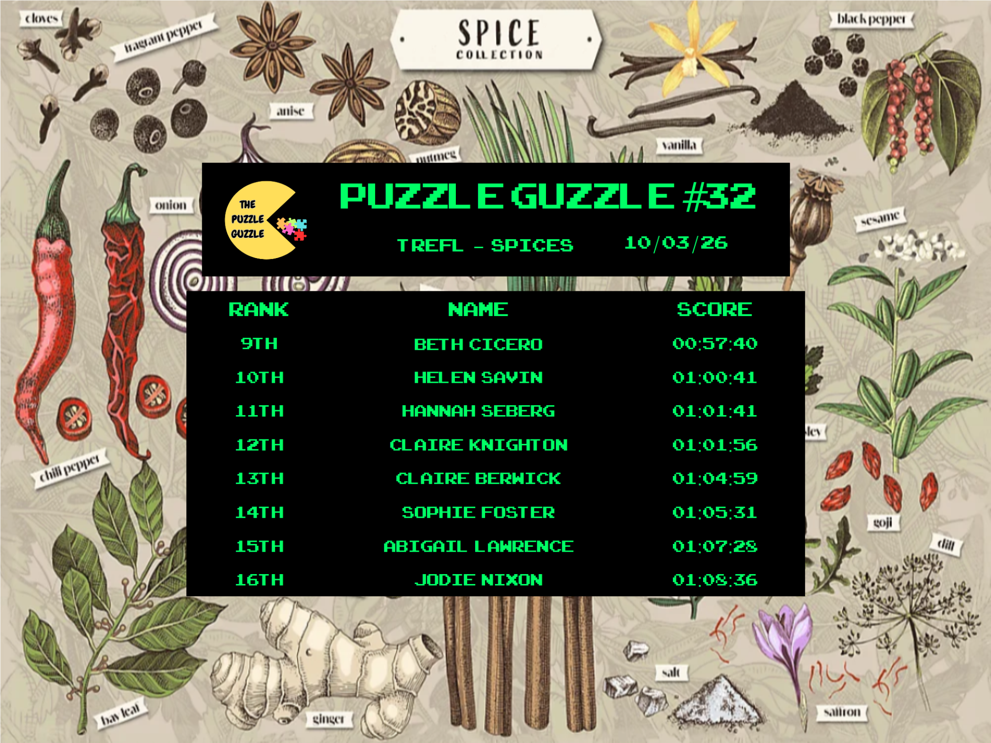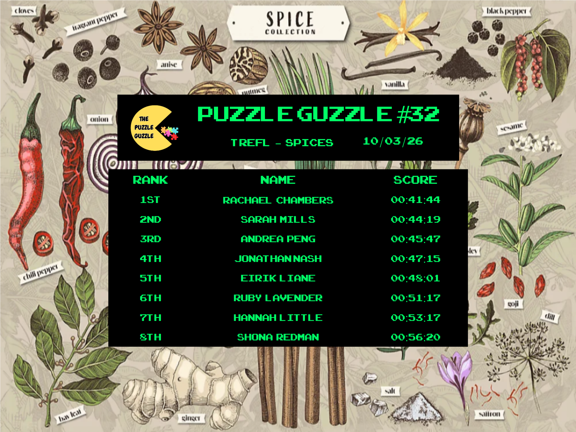 40 budding puzzlers took on this abundance of aromatics last night and with multiple members of puzzling royalty in attendance it was set to be a race for the ages! Both Rachael and Sarah sprang into action and got off to excellent starts but it was a familiar result as Rachael stormed through the final 100 pieces at a frankly disrespectful pace to take home another Guzzle victory in 41:44! Sarah comfortably secured her second 2nd place and 3rd place was harvested by Guzzle guest star Andrea Peng!