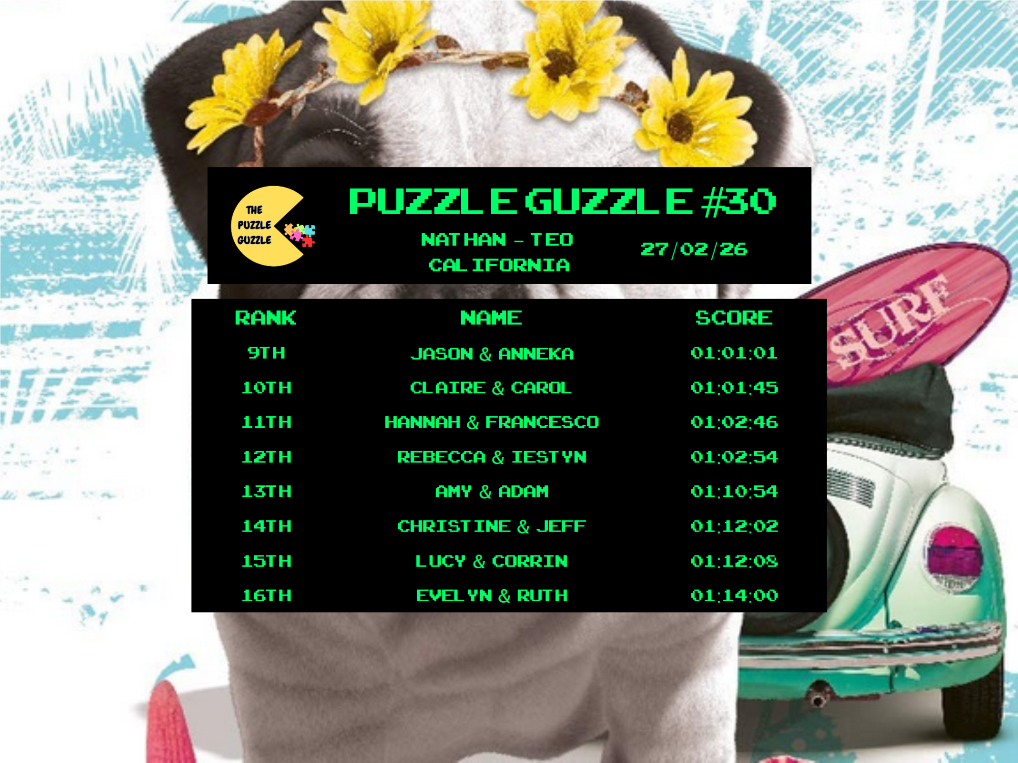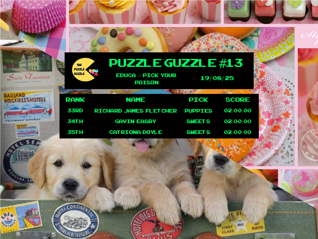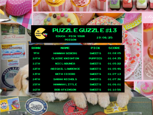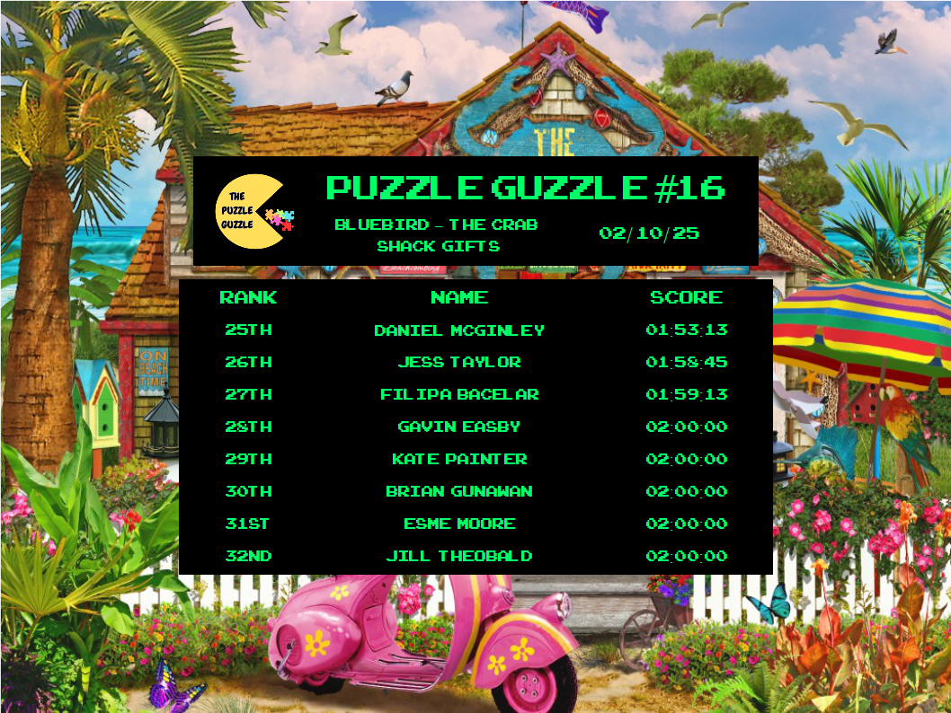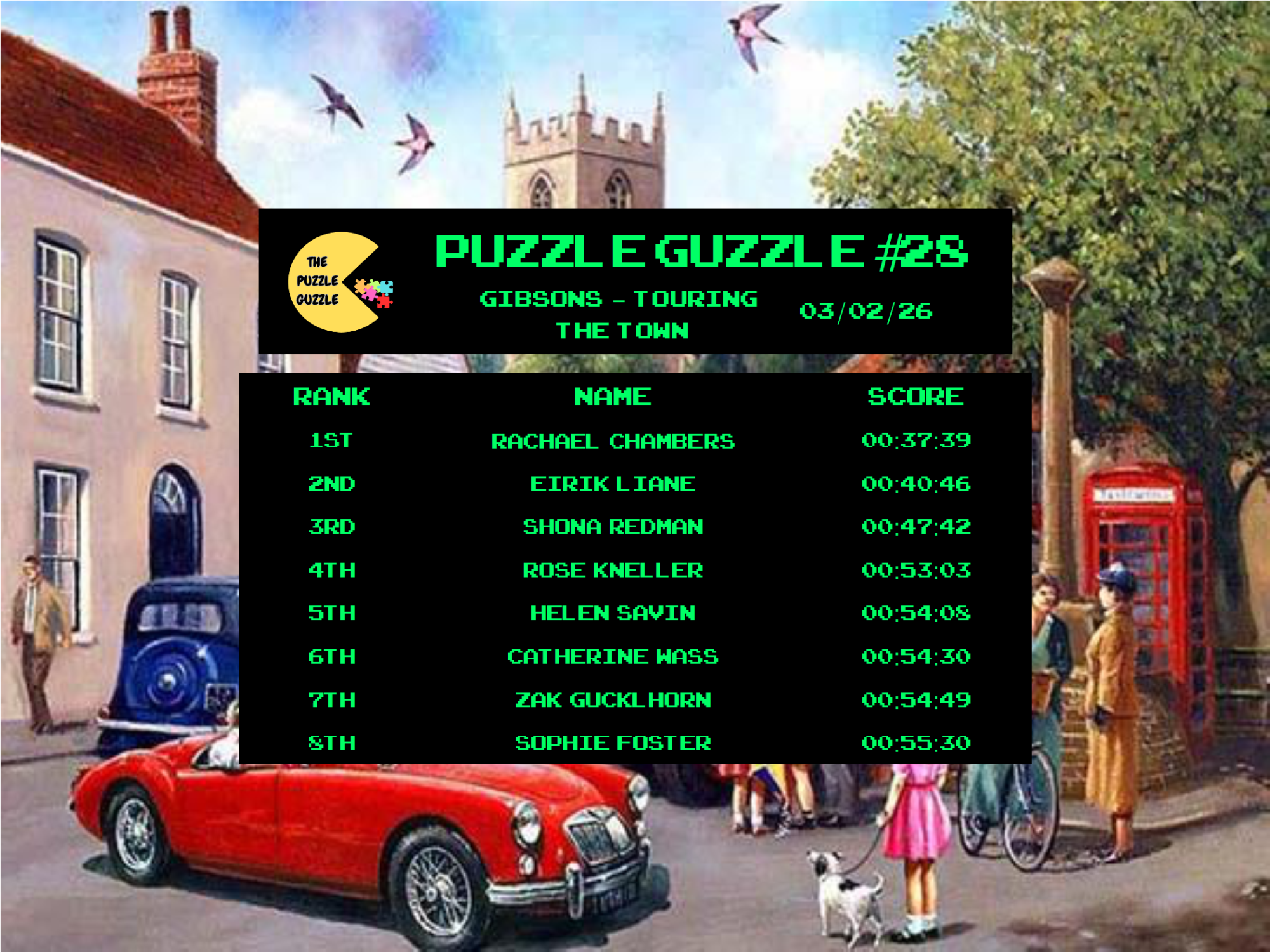 It was a Puzzle Guzzle first last night as we debuted our first ever custom puzzle for 33 parched puzzlers. The unseen image shook our competitors into a frenzy, but it was Rachael who gave a stirring performance to claim her 5th Guzzle victory with a 40:40 time! Eirik narrowly beat Ruby to the 2nd place spot in what would be the first of many close finishes. In fact there was just 3 minutes(and 6 seconds) between 5th and 13th place!