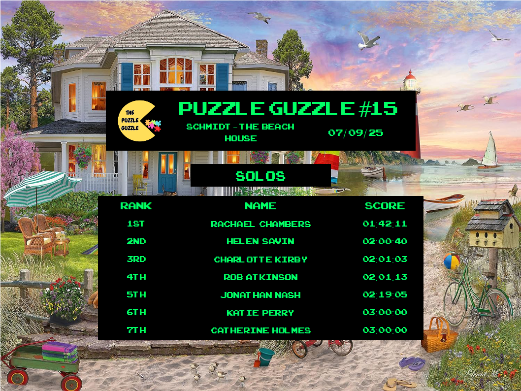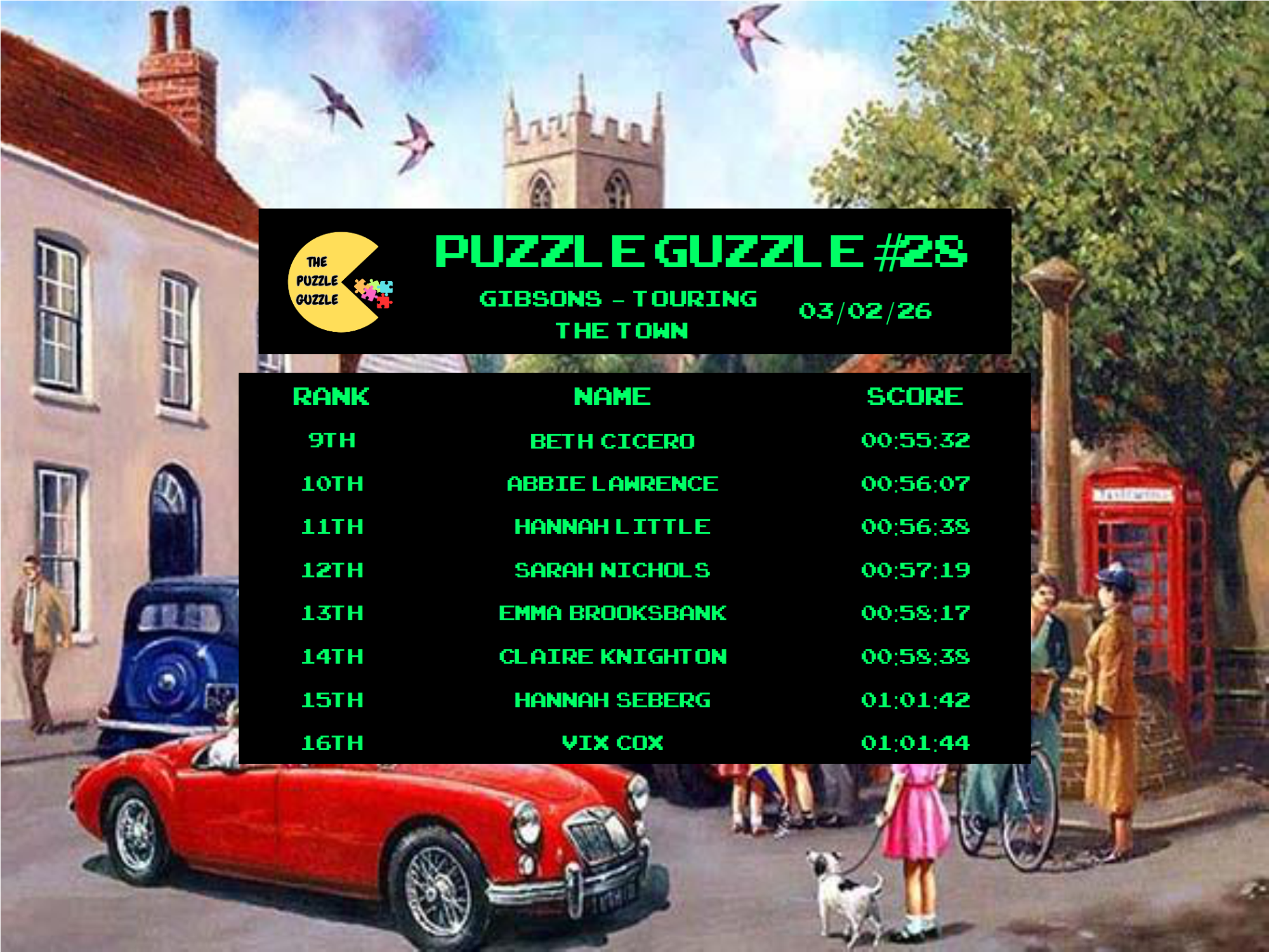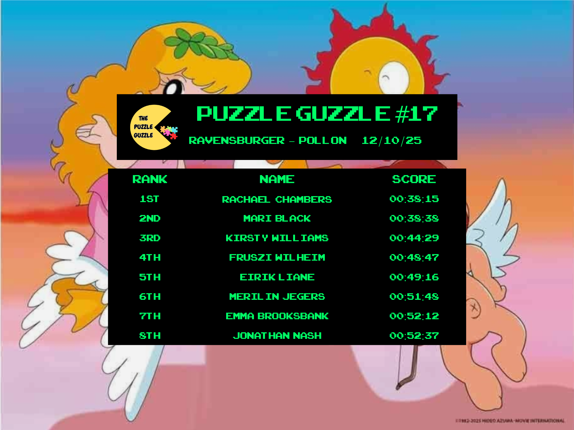 What better way to start the new era of Puzzle Guzzles than with this delightfully niche Ravensburger? It was Guzzle debutant Rachael Chambers who flew like Windel through the puzzle in a phenomenal 42:56, beating the field by almost 10 minutes! Nia Marvin continued her run of good form by picking up 2nd place in 52:18 and newcomer Eirik Liane finished in 55:09 to secure 3rd place.