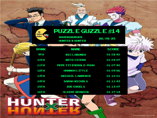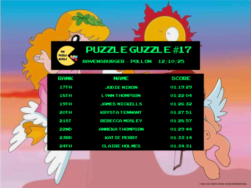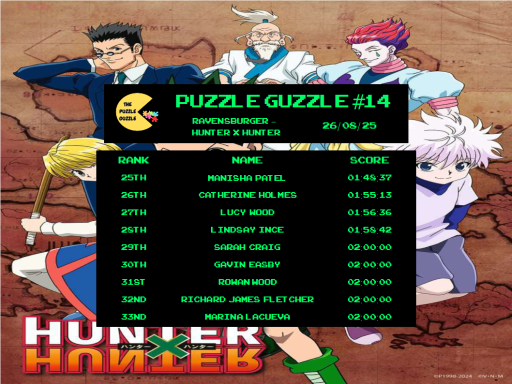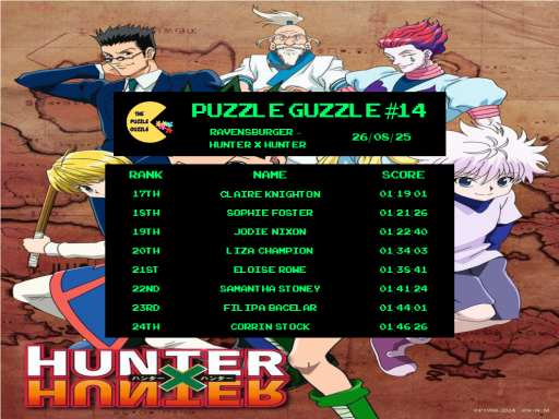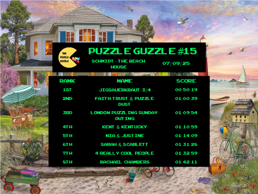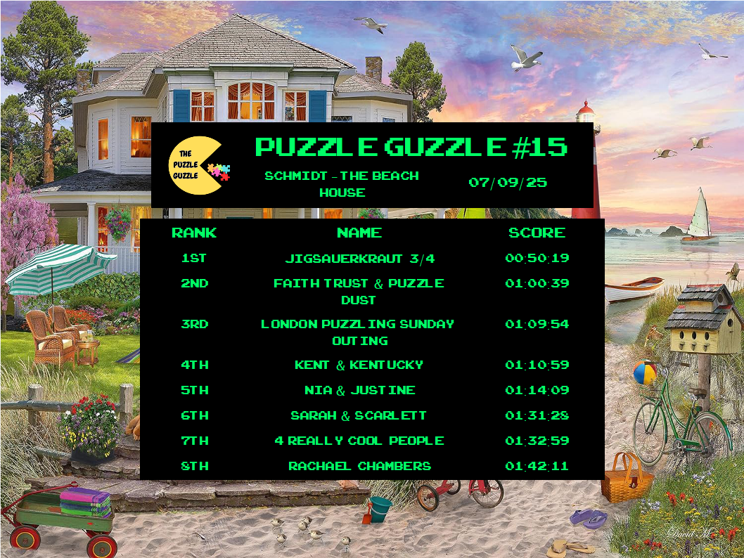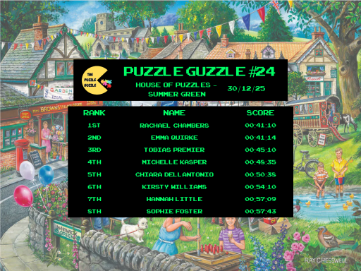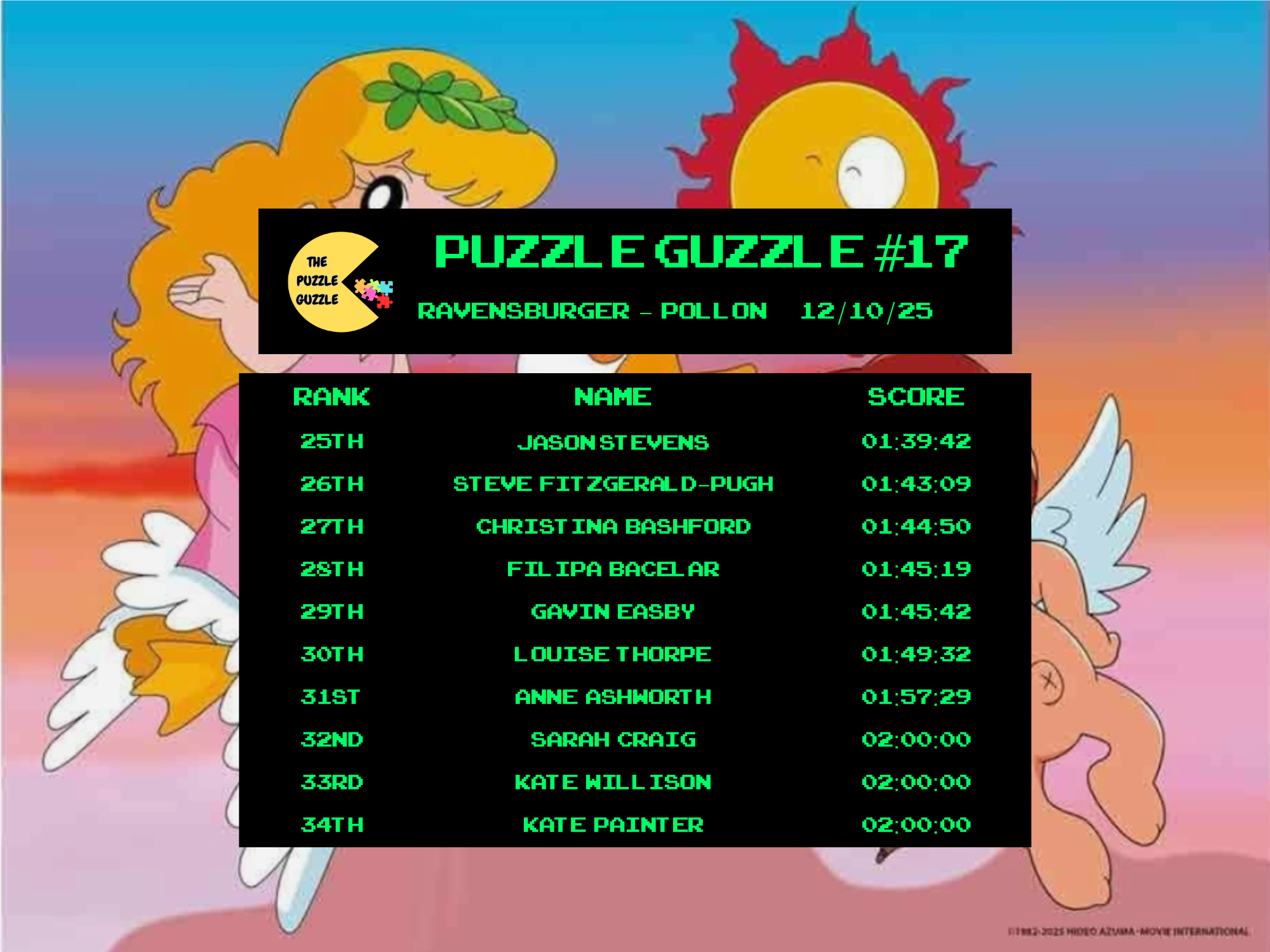 What better way to start the new era of Puzzle Guzzles than with this delightfully niche Ravensburger? It was Guzzle debutant Rachael Chambers who flew like Windel through the puzzle in a phenomenal 42:56, beating the field by almost 10 minutes! Nia Marvin continued her run of good form by picking up 2nd place in 52:18 and newcomer Eirik Liane finished in 55:09 to secure 3rd place.