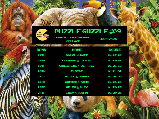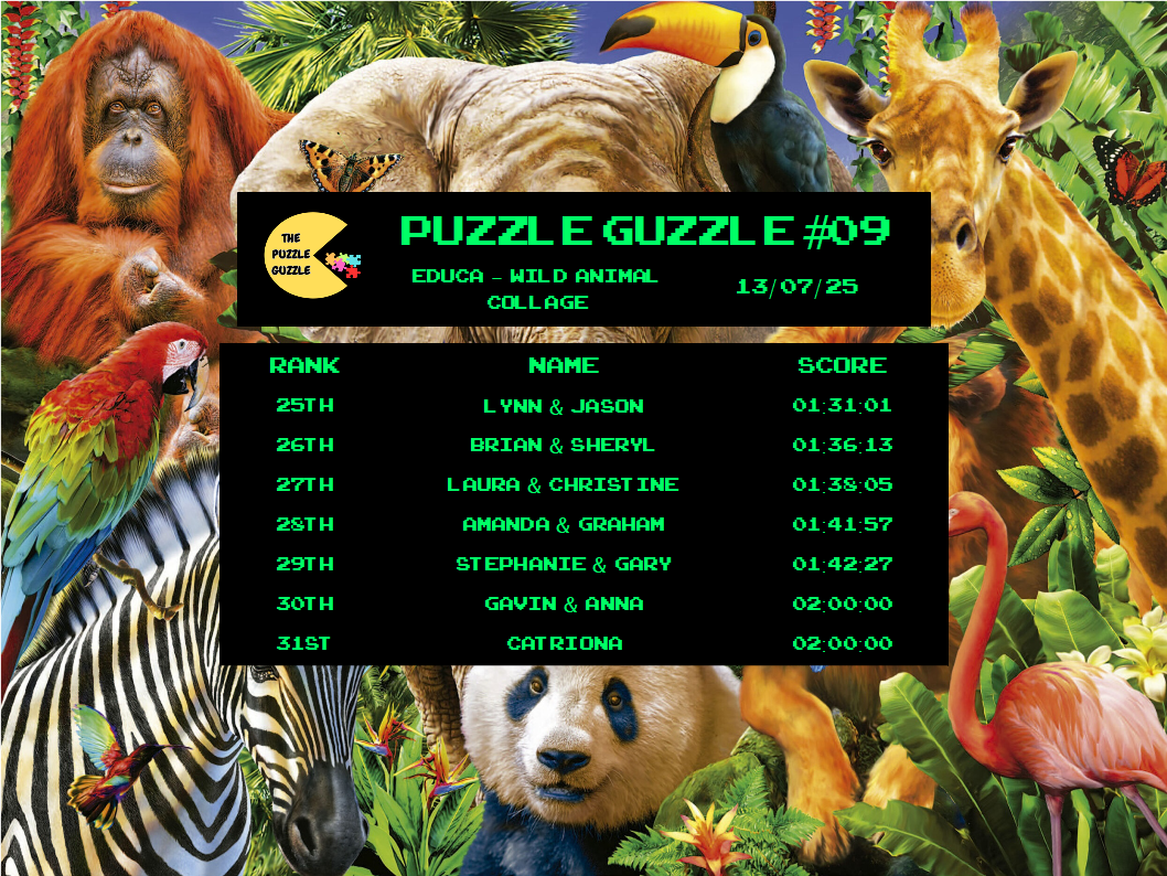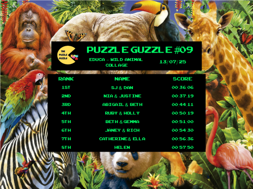 Another sweltering day around the country brought together 27 pairs and 4 solos to attack this beast of a puzzle. We onlookers marveled as flamingos formed, elephants were erected and pandas were put together, but when the puzzle dust settled it was SJ & Dan who narrowly managed to defend their pairs title with a time of 36:06, beating Nia & Justine by just over a minute in our closest race yet! Abigail & Beth snared 3rd place with a time of 44:06 and a shout out to fastest solo competitor Helen whose 57:50 time was good for 8th place in the combined leader-board!