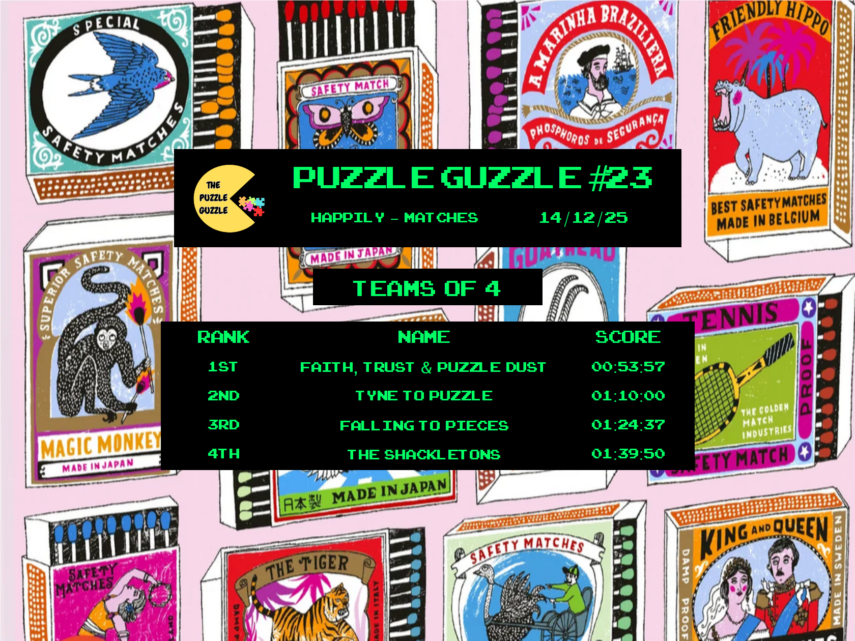 34 Olympians joined us on Sunday to puzzle amongst the gods. It was a sprint not a marathon and an extremely close one at that, with Puzzle Guzzle colossus Rachael Chambers seizing victory in 38:15, beating special guest Mari Black by just 23 seconds! Kirsty Williams completed the podium with her fantastic 44:29 time.