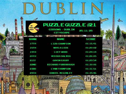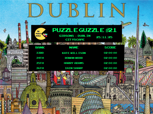 36 topological tourists took a trip round historic Dublin last night for our latest competition. Aptly we had multiple British champions in the field for our first ever Gibsons competition, but it was Rachael who triumphed with her trademark precision, completing the puzzle in a mere 38:43 to make it a record-equalling 4 wins in a row! Hot on her heels was speed-puzzling legend Sarah Mills who made her Puzzle Guzzle debut with 2nd place and a fantastic 45:58 time, and Fruzsi beat out some of the UK's finest to claim the final podium place!