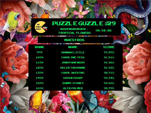 It was quite the morning as we held our first "Maestros & Debutants" event, with a field of 8 first-timers and 29 seasoned Guzzle veterans taking on this 300 piece puzzle. The image managed to contain all the 5 Fs of puzzling (Fur, Feathers, Flowers, Foliage and Fun!) so there was something for everyone, but it was SJ who claimed mastery over them all as she blazed through the image in a superb 28:37 for her first solo victory!