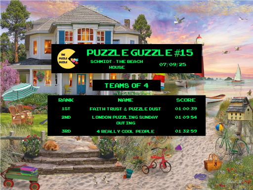 45 puzzlers across 4 divisions joined us on Sunday to match their wits against our selected 1000 piece puzzle. It was "Faith, Trust & Puzzle Dust" who burned the brightest, completing the puzzle in a mere 53:57 to win the 4-player category and the competition overall! Not far behind were 2 terrific trios, with "London Puzzling 1" edging out "Team Chambers" by just 2 minutes!