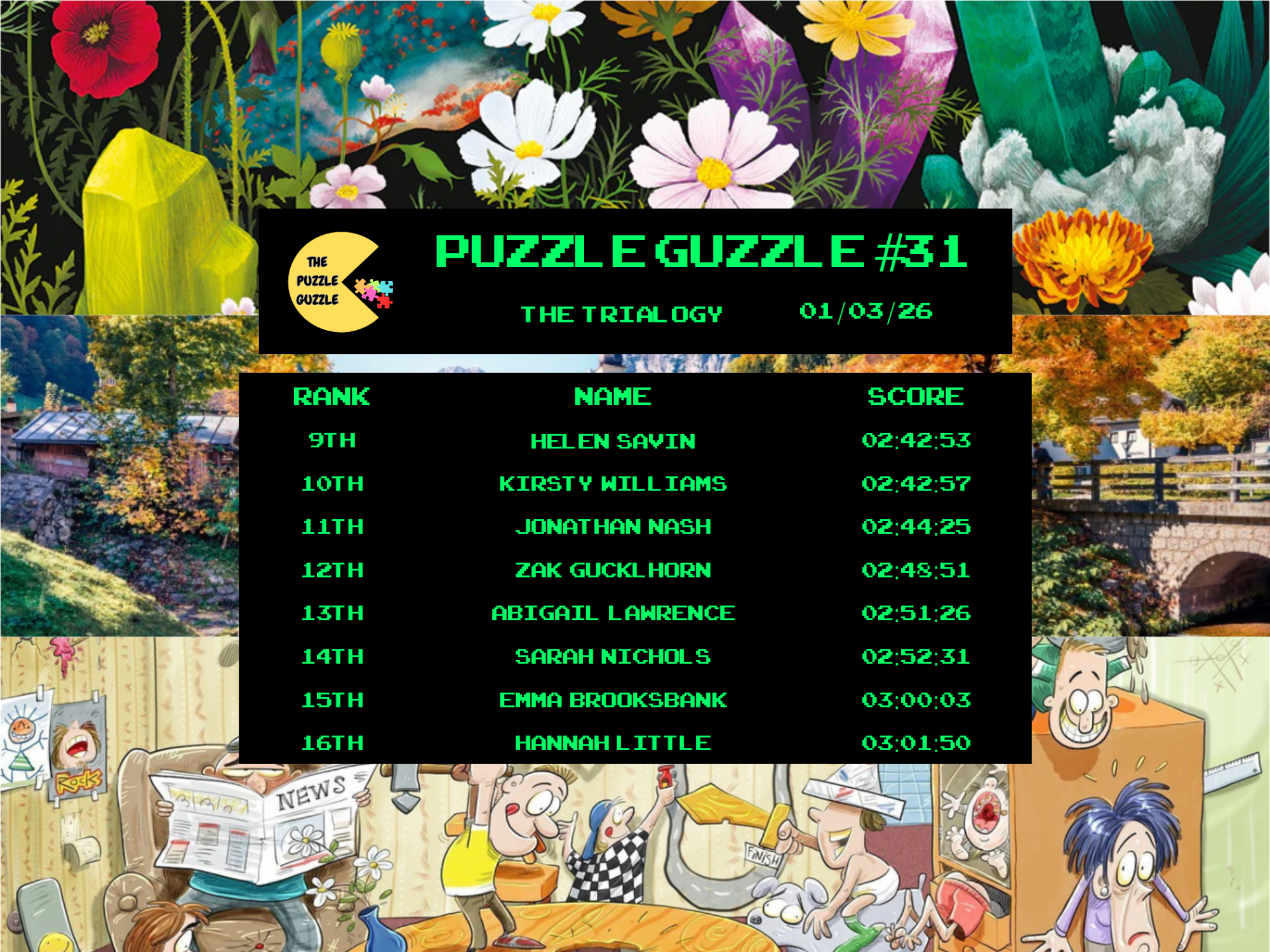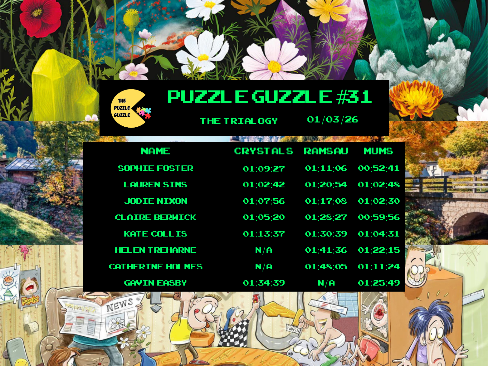 Sophie Hill stormed on to the scene with 5th place in her Puzzle Guzzle debut whilst Helen MacDougall slashed almost 10 minutes off her predicted time to grasp the elusive Madeley's Maestro award! And a shout out to autumnal adept Hannah Little, the quickest to complete the October puzzle and the only one to do it in under an hour!