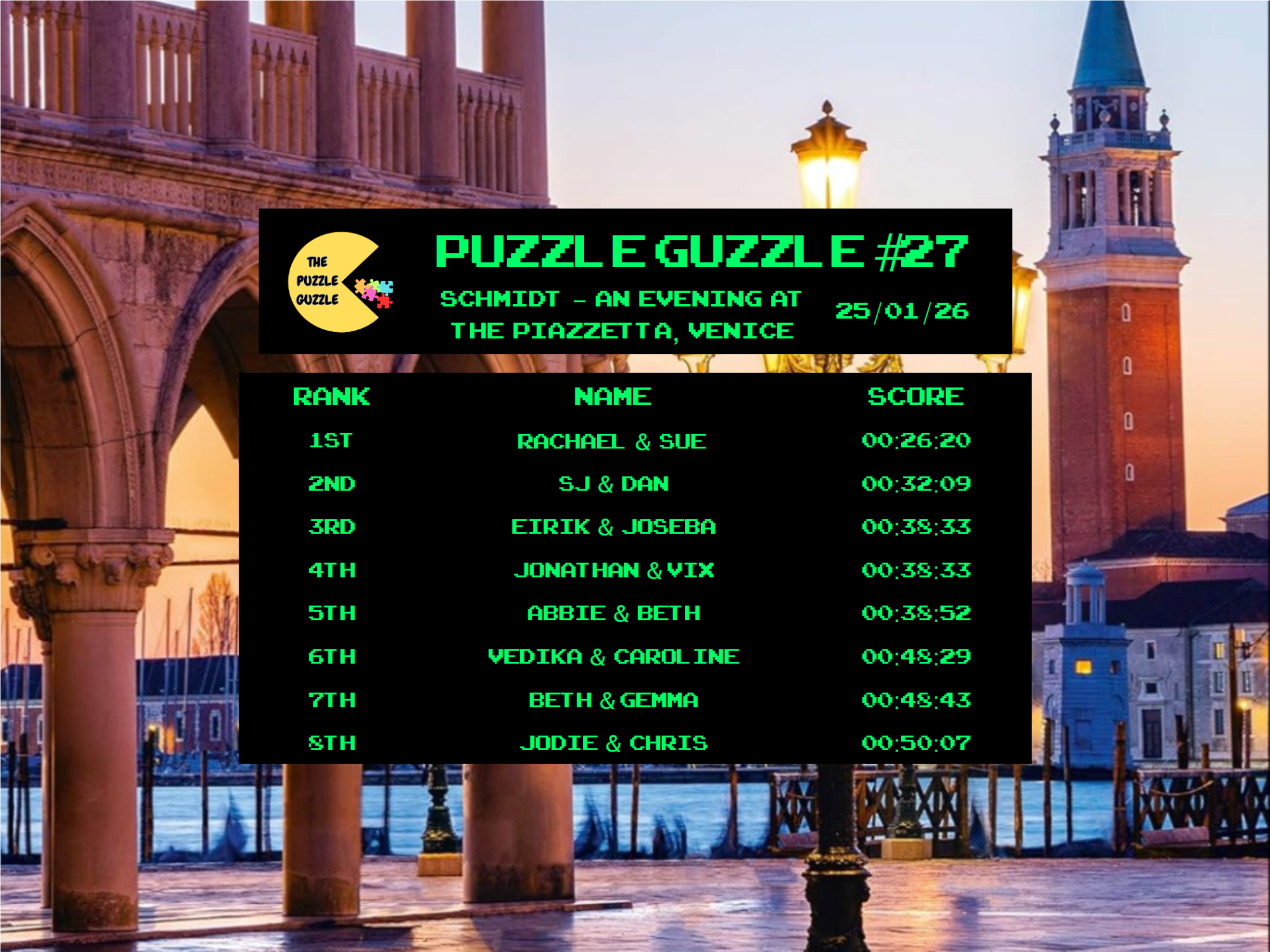 The finishes continued to flow in with 13 pairs completing this challenging photograph in less than an hour! As we cheered on the incoming puzzlers and the chatter turned to the topic of the day (pizza toppings of course), Helen declared herself as the big cheese with her time of 01:05:33 being good enough to take the solo crown!